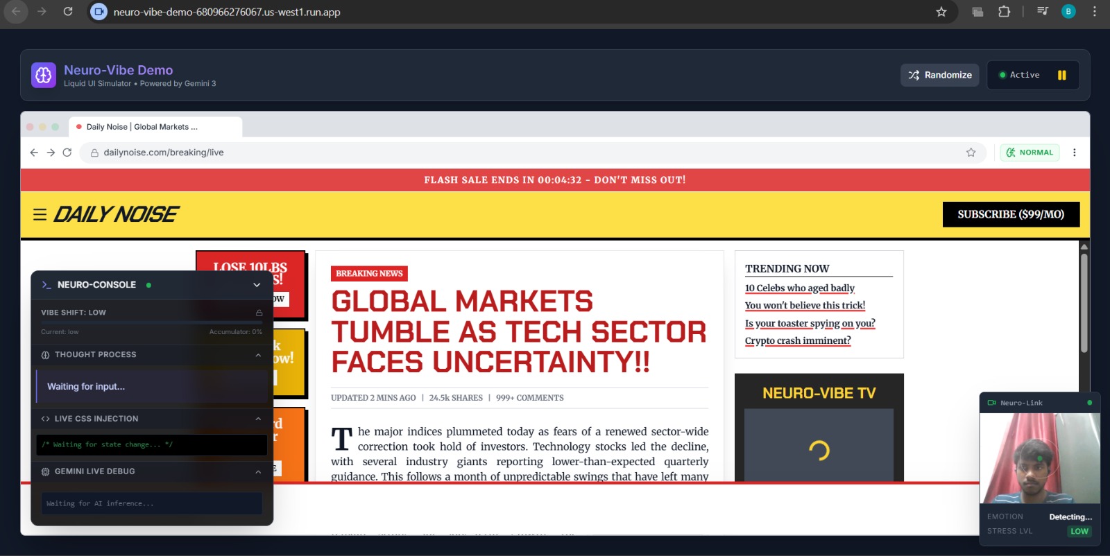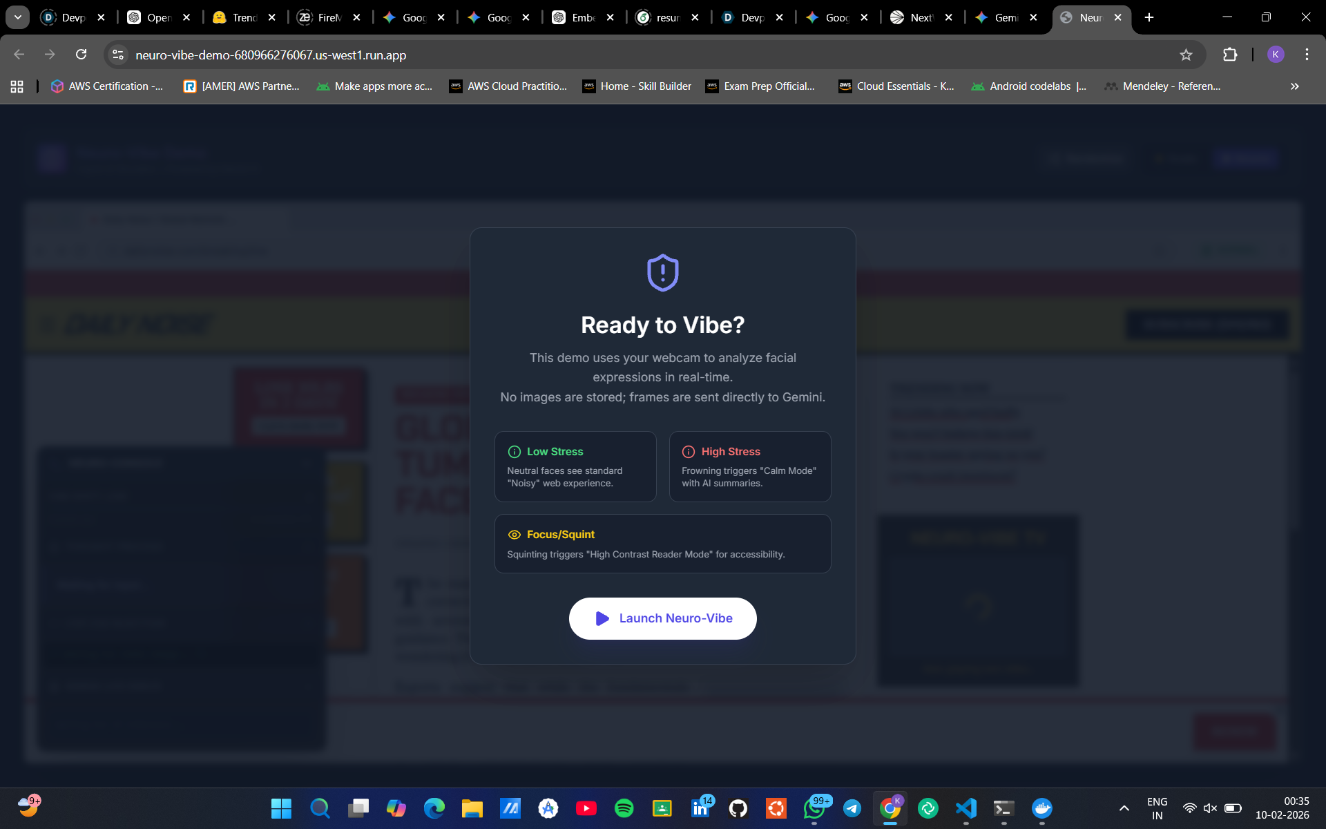 Neuro-Vibe is a dynamic accessibility engine. It uses a webcam-enabled "vibe check" to detect signs of cognitive load or stress in a user's facial expression. Once detected, it triggers Gemini 3 to perform "Vibe Coding"—instantly generating and injecting custom CSS and JS into the webpage.