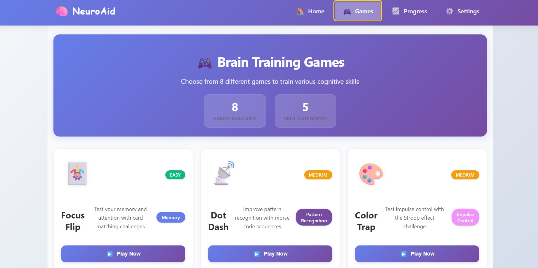 NeuroAid is a comprehensive cognitive training platform featuring eight specialized brain training games, each targeting different cognitive skills:
