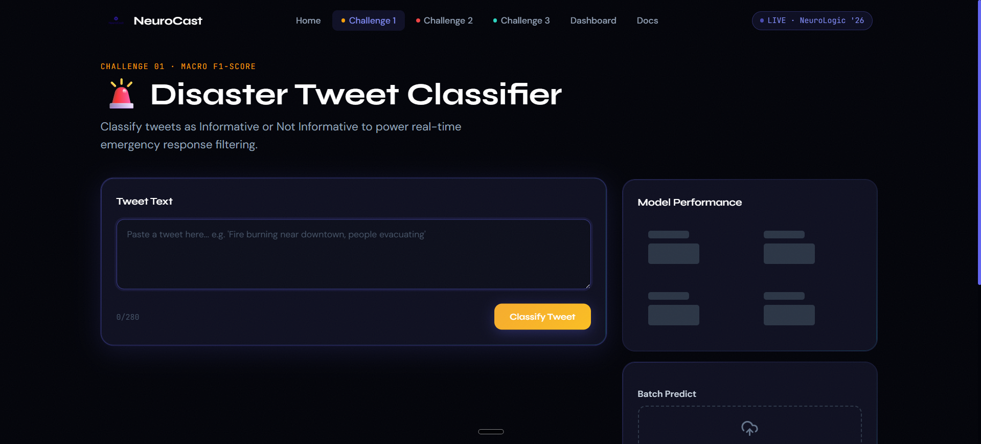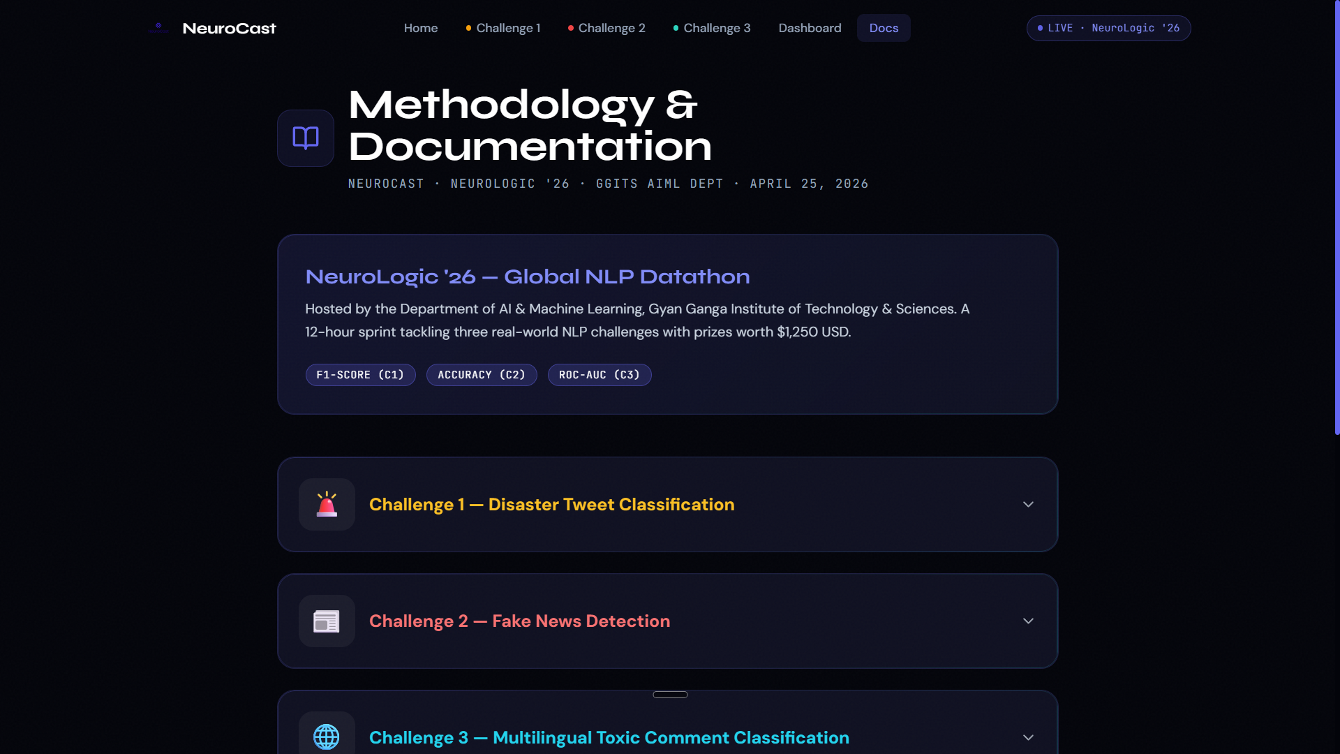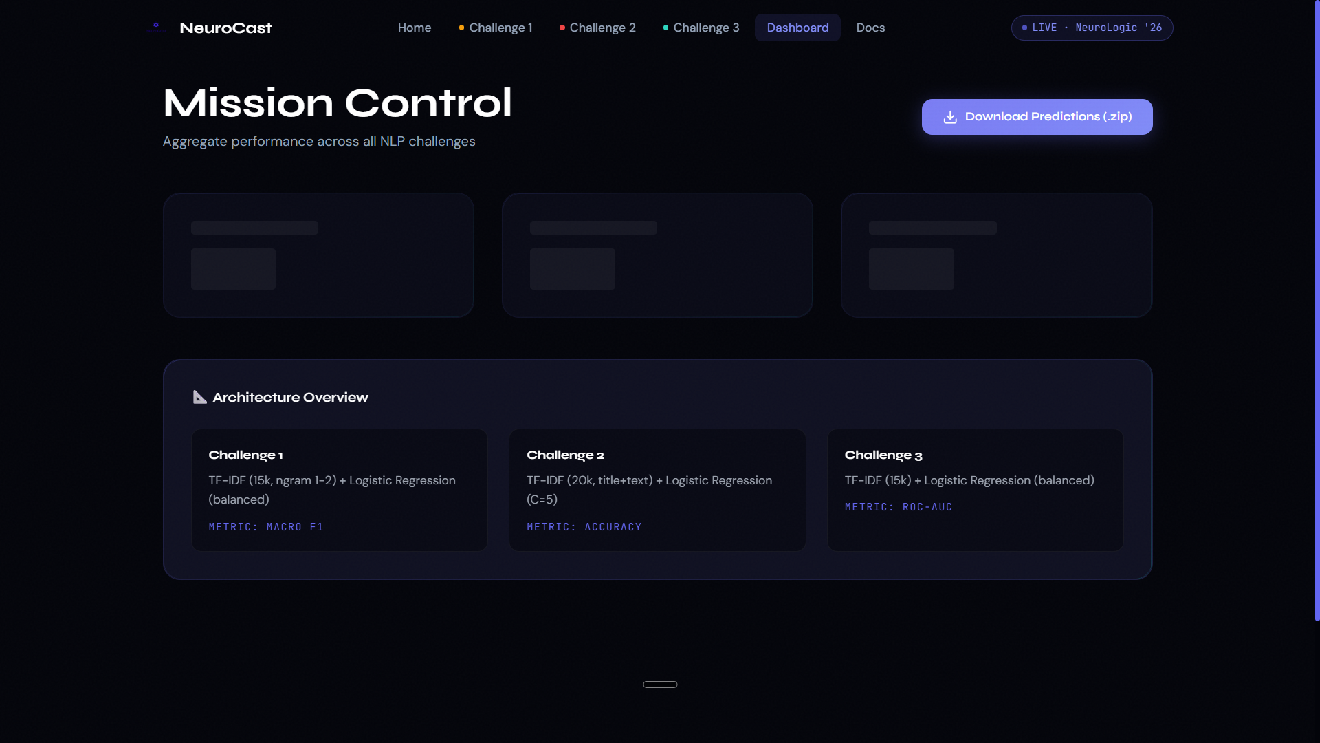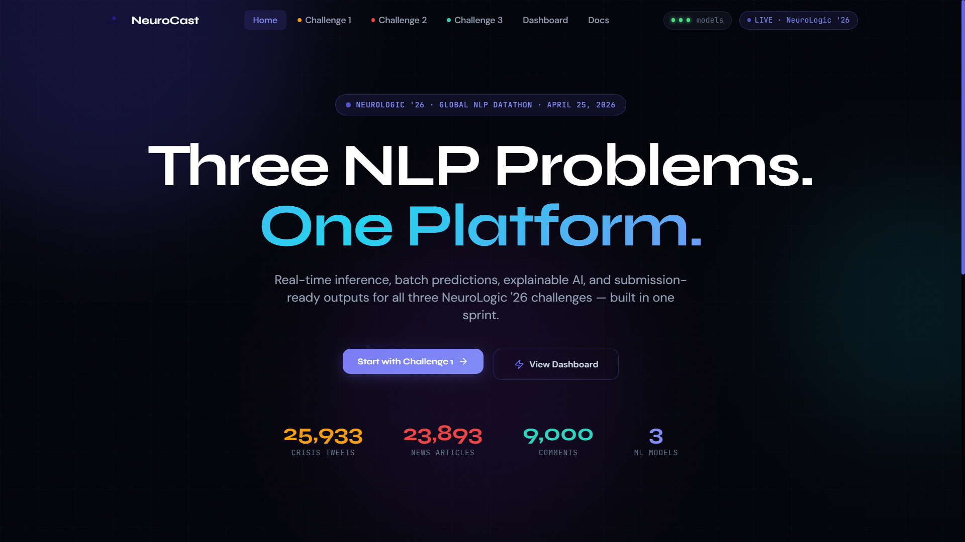 NeuroCast is a full-stack NLP intelligence platform built for the NeuroLogic '26 Global NLP Datathon. It addresses all three competition challenges in a single, cohesive application with real machine learning models, live inference, and downloadable submission files.