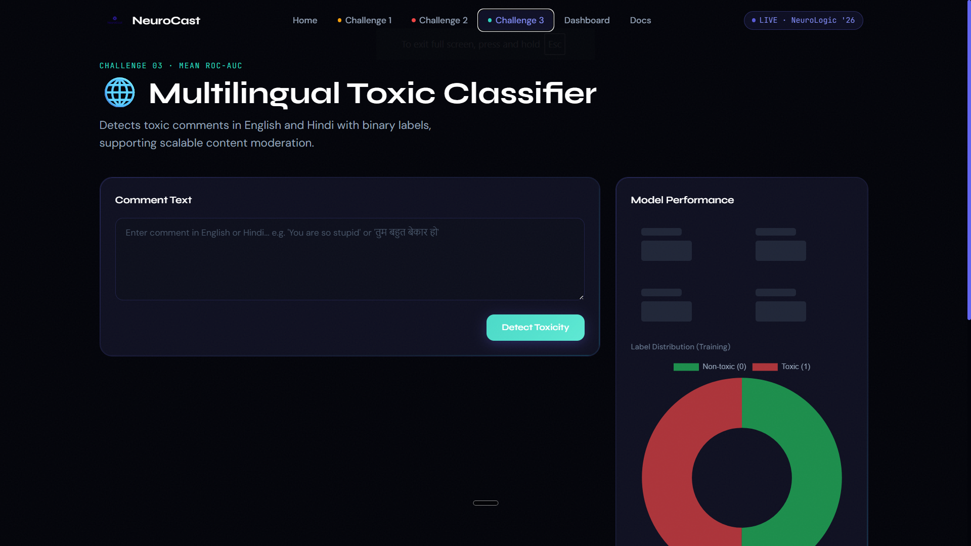 Platform Features: Real-time single-text inference with confidence scores for all three challenges Word-level influence heatmaps showing which tokens drove each prediction (from Logistic Regression coefficients) Bulk CSV/XLSX batch prediction with instant downloadable results Per-challenge model metrics dashboards (F1, Accuracy, ROC-AUC, Precision, Recall, Confusion Matrix, ROC Curve) Model comparison: Logistic Regression vs Naive Bayes vs SVM side-by-side Multilingual language detection (English vs Hindi auto-identification) One-click download of all three submission CSV files bundled as a ZIP Mission Control dashboard aggregating all metrics in one view Live backend health monitoring in the UI
