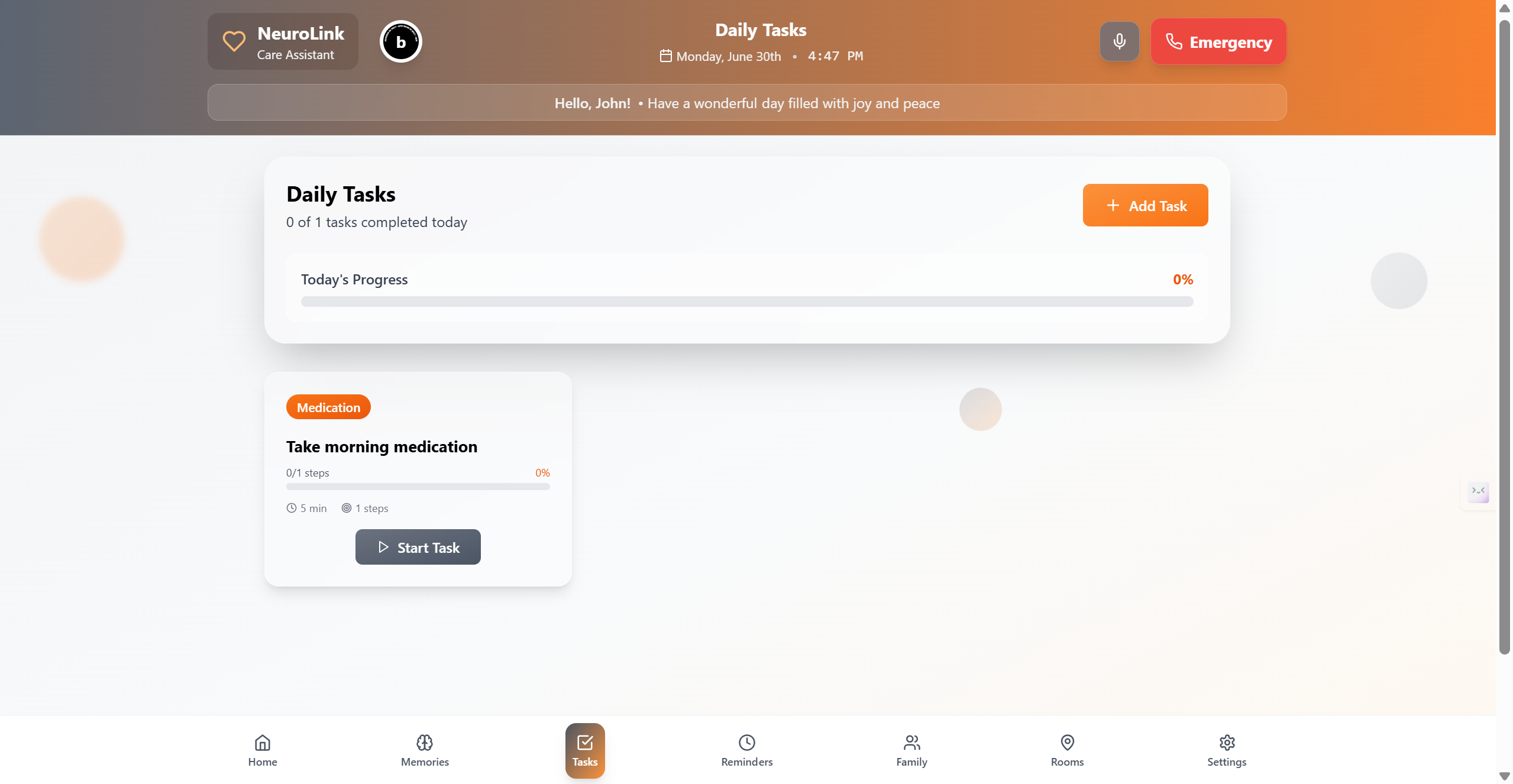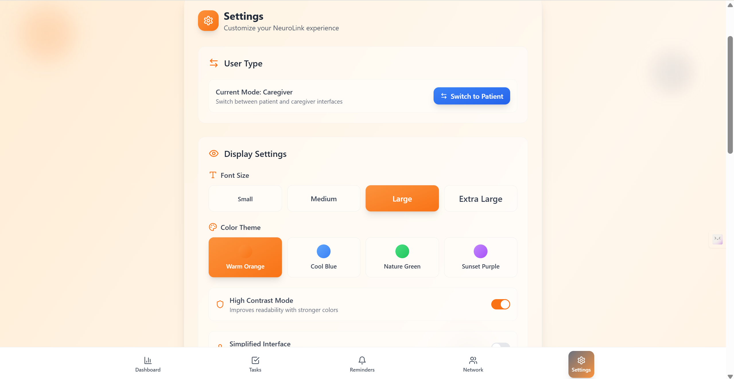 NeuroLink bridges the communication gap between dementia patients and their caregivers by providing a shared digital space. Caregivers can easily schedule tasks, reminders, and wellness check-ins, which are automatically delivered to the patient in a simplified, distraction-free interface. Designed with empathy, the app uses soft visuals, large actionable elements, and calming transitions to reduce cognitive overload. Instead of overwhelming the user, NeuroLink gently guides them — supporting independence while keeping caregivers connected and in control.