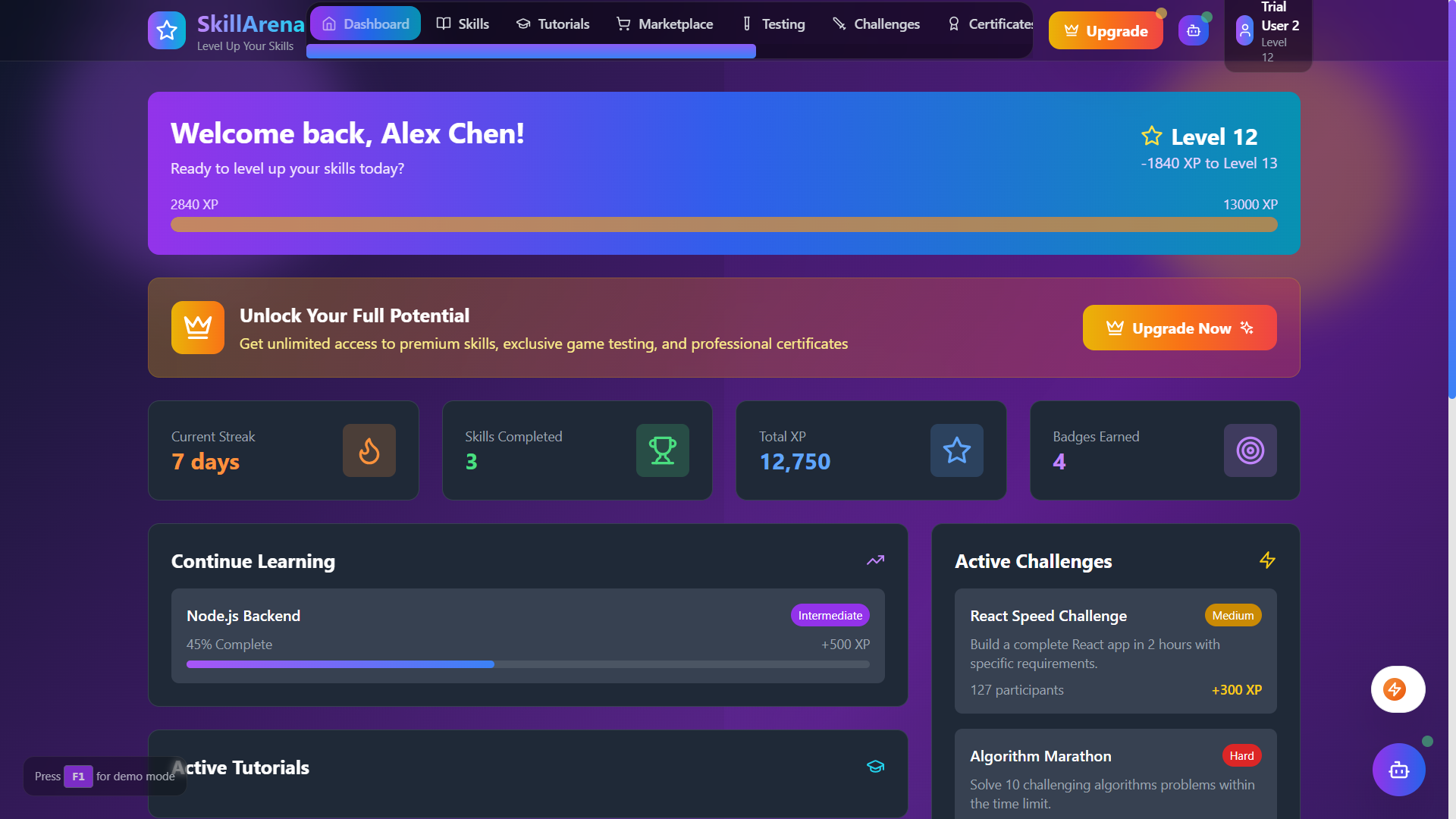 . Dashboards: Track XP, streaks, and progress with skill tree visuals.
