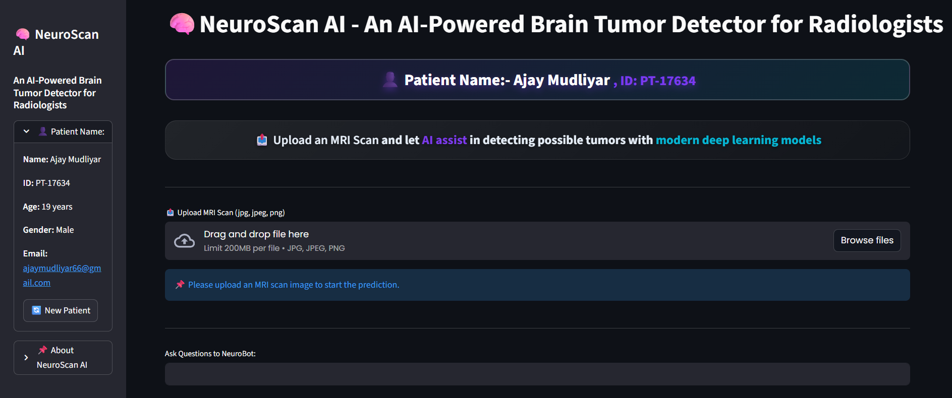 “NeuroScan AI main screen: upload MRI scans, view guidance, and interact with NeuroBot in one focused clinical workspace.”