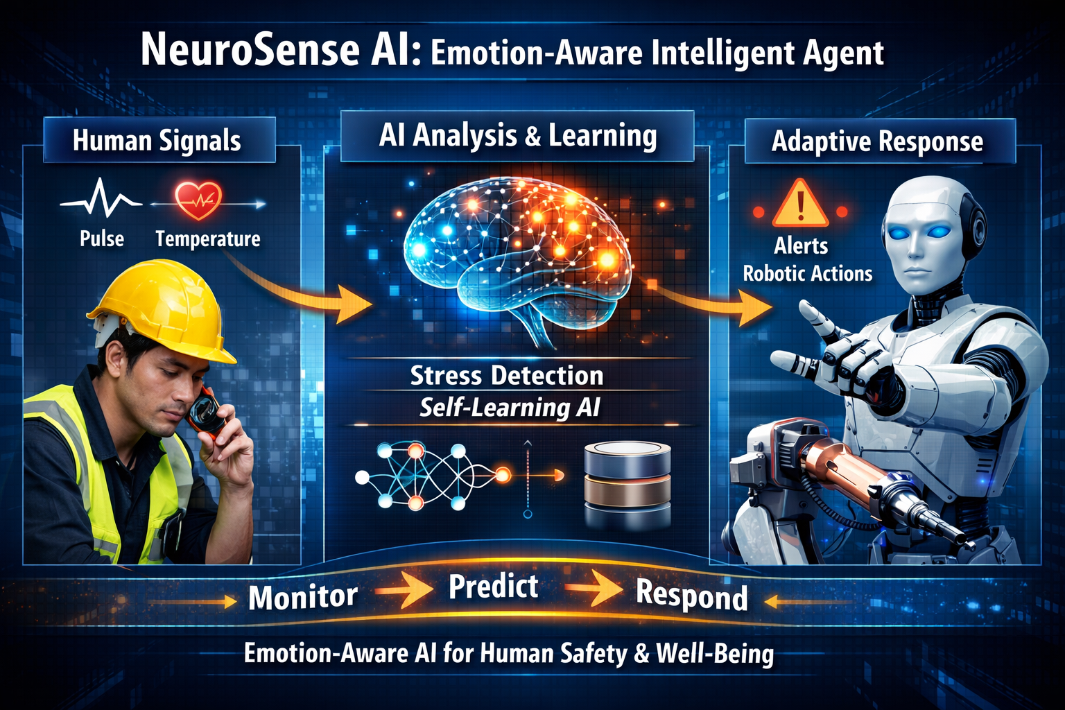 NeuroSense AI is an emotion-aware intelligent agent that monitors human physiological signals such as pulse rate and body temperature.