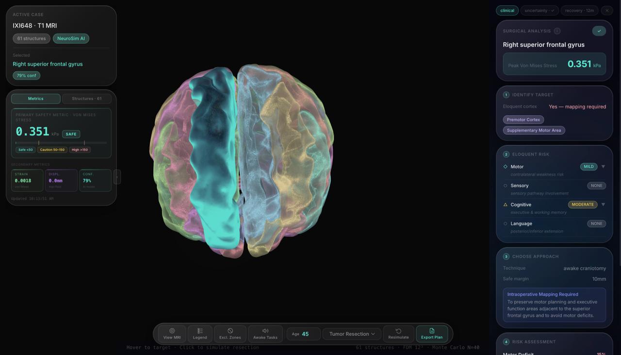 NeuroSim was built to bridge medical imaging, interactive 3D visualization, and AI-driven risk analysis into one unified surgical planning system.
