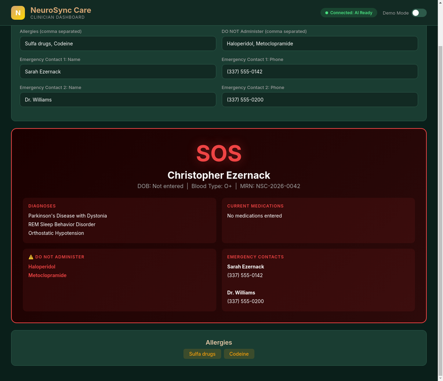I live with a complex neurological condition. Every day involves symptom instability, medication timing, multiple providers, caregiver coordination, and strict diagnostic and procedural coding requirements. My neurologist needs structured data. My caregiver needs real-time updates. First responders need immediate access to critical information. Providers need ICD-10 and CPT alignment for accurate reimbursement.