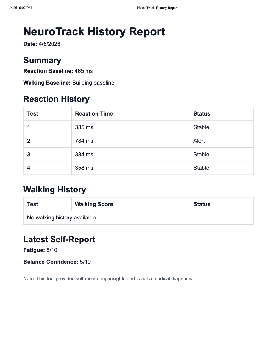NeuroTrack benefits individuals with neurological conditions such as MS. By enabling continuous tracking, it supports earlier awareness of potential changes and encourages more informed self-management. For example, a user may notice a gradual decline in walking stability over several days, even if they do not consciously feel different. The system can highlight this trend, prompting the user to rest, adjust activity levels, or consult a healthcare provider earlier than they otherwise would. NeuroTrack may also help users recognize patterns of change that precede flare-ups in conditions like MS. By identifying deviations from a personal baseline, the system supports earlier awareness and more proactive self-management without making predictive medical claims. The system is very feasible, using existing smartphone capabilities and simple user interactions. The current prototype demonstrates core functionality, including data collection, baseline calculation, trend visualization, and report generation. NeuroTrack is scalable as a mobile application and can be extended to integrate additional biomarkers or clinical workflows in the future.