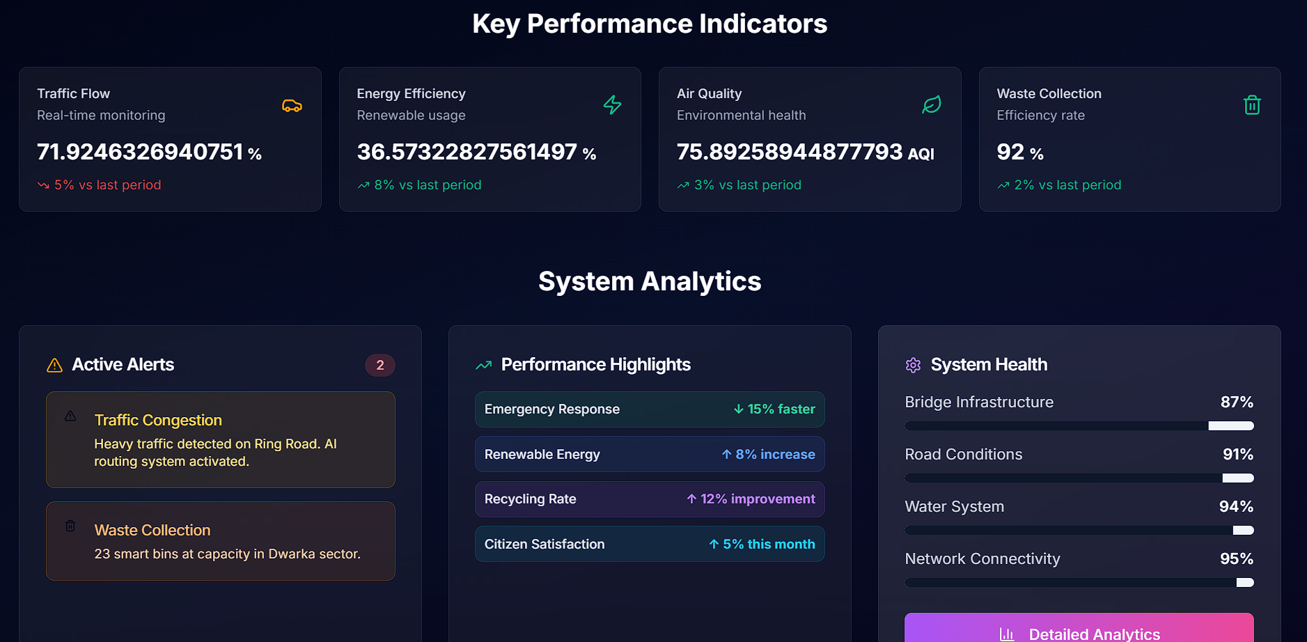 We were inspired by the urgent need for integrated urban governance solutions in fast-growing cities like Delhi. The goal was to leverage AI and IoT to build a centralized platform that empowers administrators with real-time insights and predictive analytics for better decision-making.