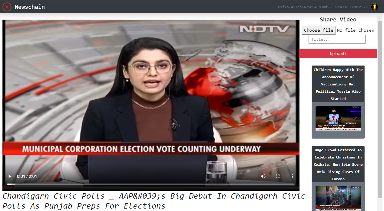 When a video is uploaded, it gets hosted on Interplanetary File System (IPFS) by consuming some ether(ETH). As actual cryptocurrency ETH will costs me a lot of money for again and again hosting on Ethereum Main Net Blockchain as during development we tests our application many time by doing changes in it and as you know if we did changes in blockchain application then we need to again publish it on the network as previous version of application ones uploaded it can't be changed, hence I have used Ganache which provides us a local Blockchain network for development purpose and Metamask chrome extension to communicate with the Ganache Blockchain network and confirm the transactions. After uploading a video it generated a unique hash for this video and hence a IPFS URL for this video. Blockchain code is written in smart contracts using solidity programming language for the backend logic like how we want to structure and upload the videos etc. These smart contracts are deployed on blockchain by making their build version using Truffle commands. This applications then displays the News videos uploaded on the front-end user interface using React! Web3 library used to connect React front-end with blockchain network and whenever we make any transaction on it, Metamask confirmation pop-up automatically comes.