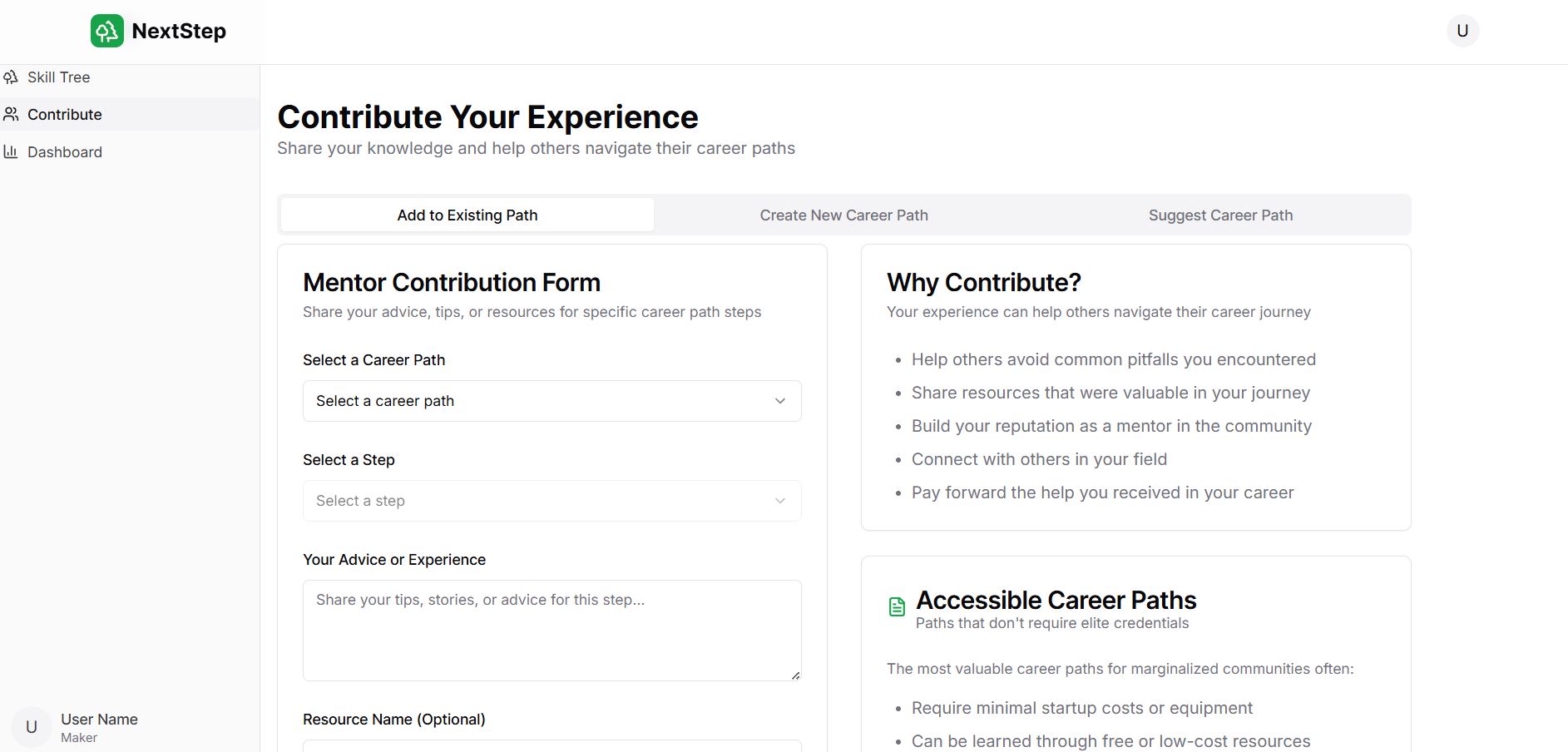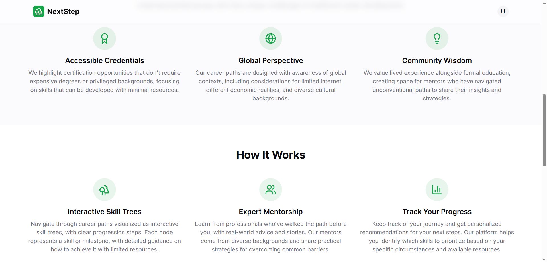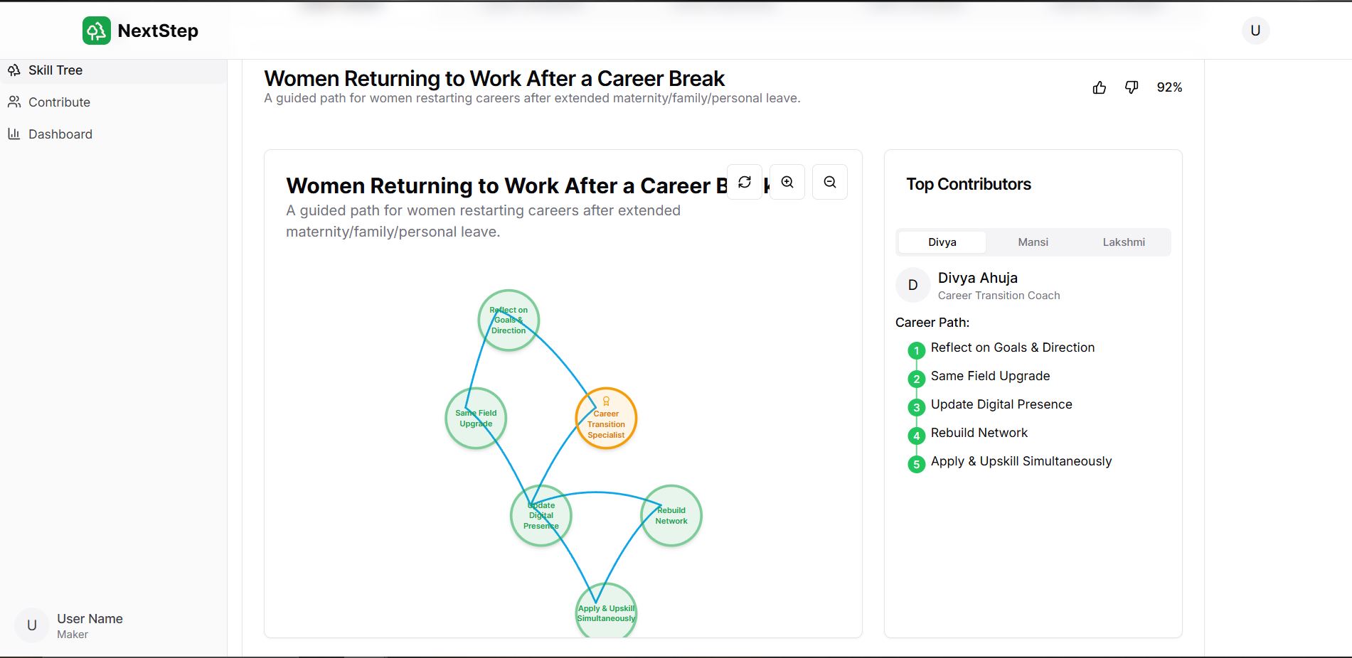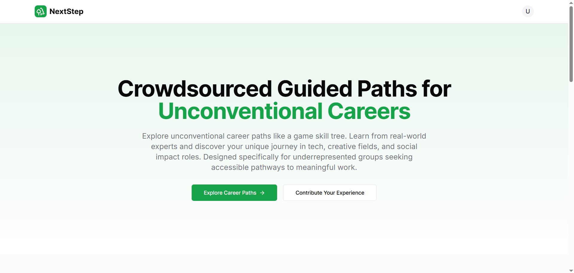 Many people navigating career changes, especially women re-entering the workforce, neurodivergent learners, or those from rural areas, struggle to find clear, accessible guidance. Existing platforms are either paywalled, too generic, or not actionable. We wanted to change that with NextStep: a platform offering visual skill trees and real mentor insights to guide users through unconventional but meaningful careers.