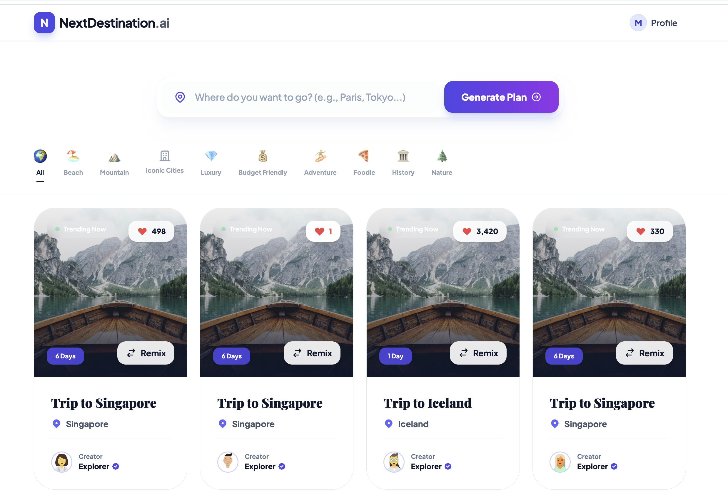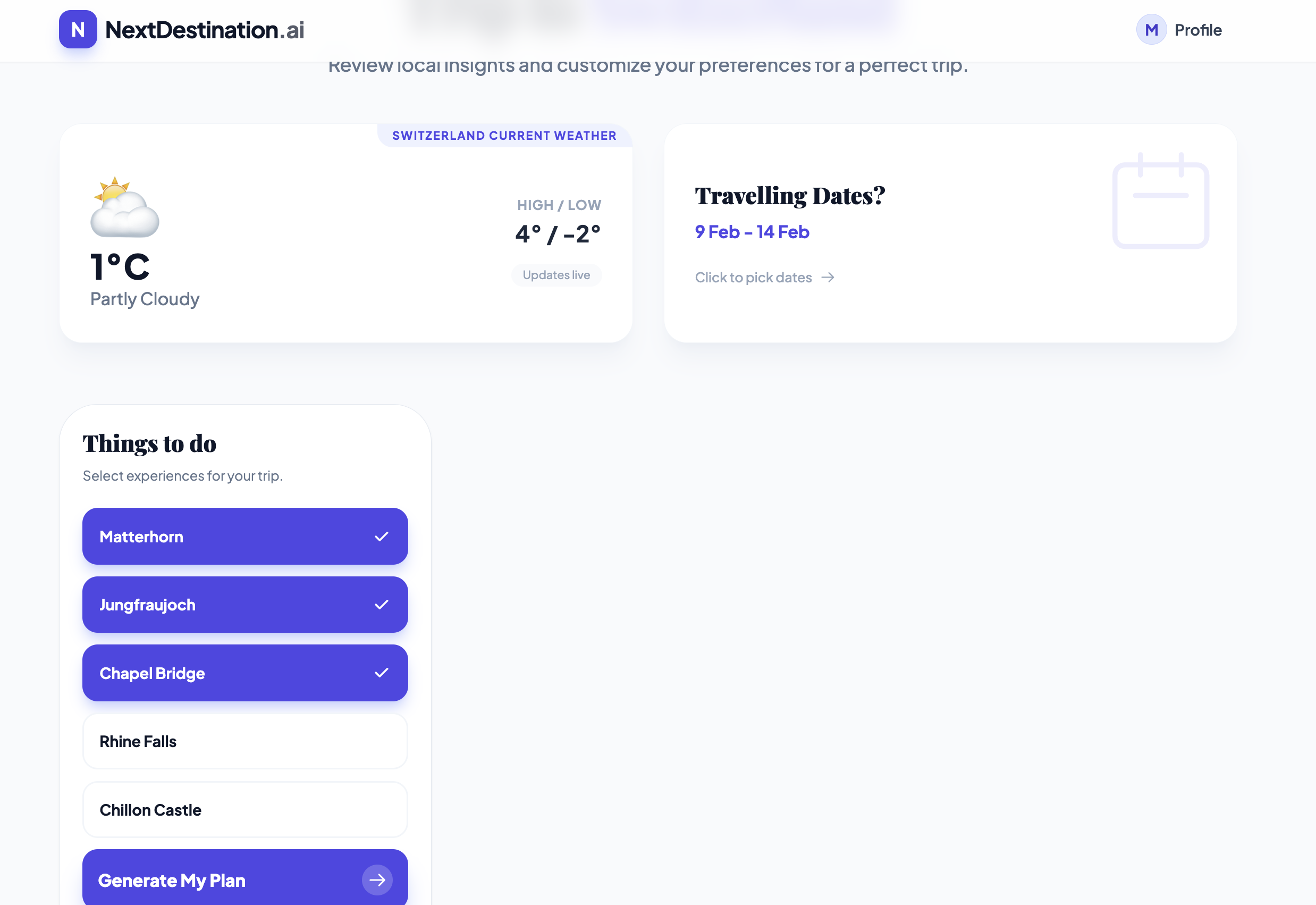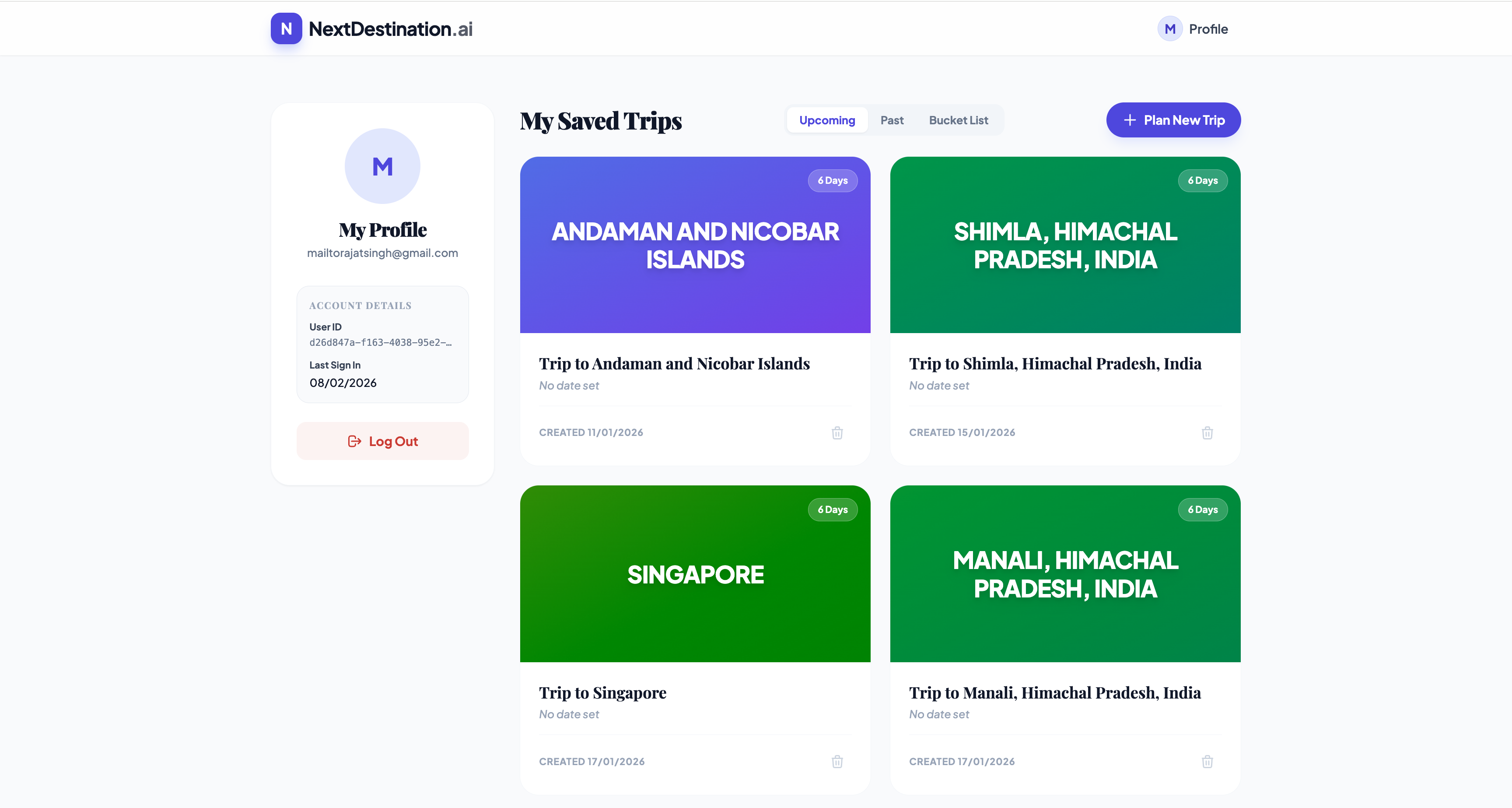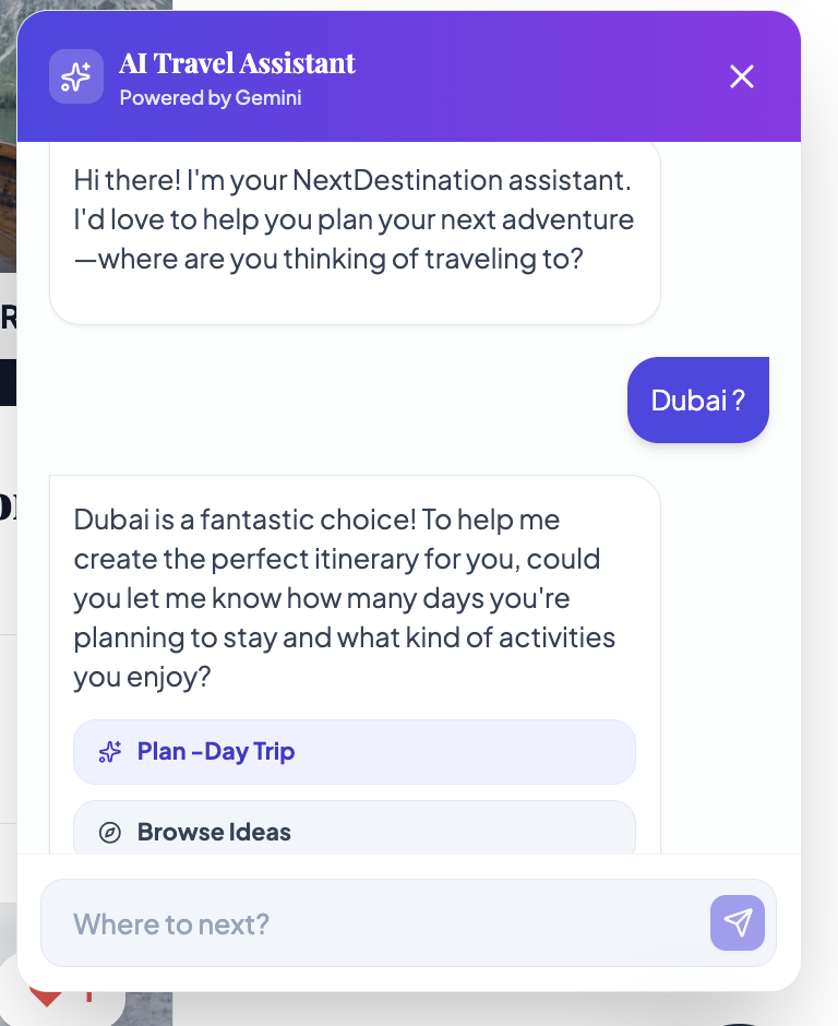 NextDestination.AI simplifies travel planning by bringing everything into one place. Users can discover trips, build custom itineraries with AI, explore places on maps, check hotels, view weather insights, and get safety and local information—without switching between multiple tools.