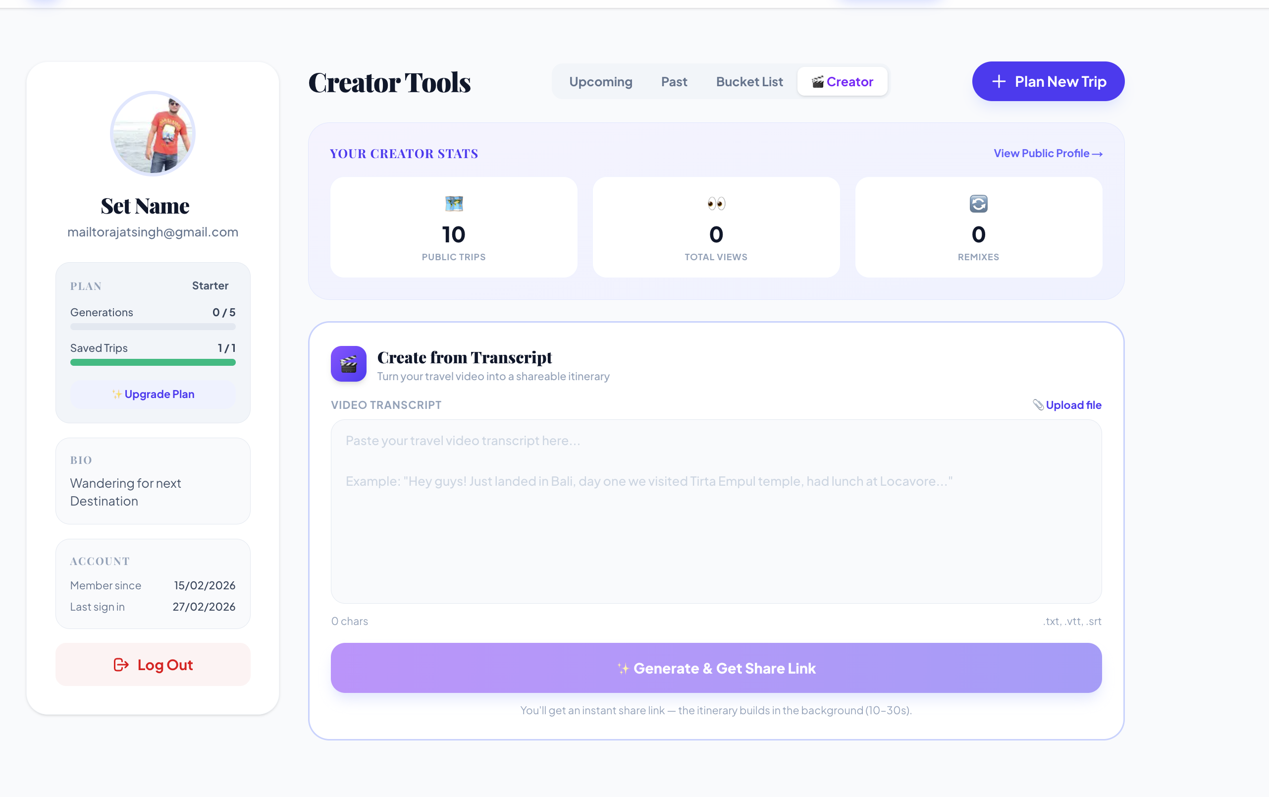 We have an exciting roadmap ahead: Voice-based AI Agent integrated directly into the itinerary builder Features for solo travelers and travel influencers to share itineraries via links Shareable itineraries embedded in YouTube video descriptions YouTube-inspired itineraries: Video transcript → AI-generated complete travel plan