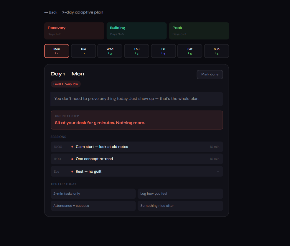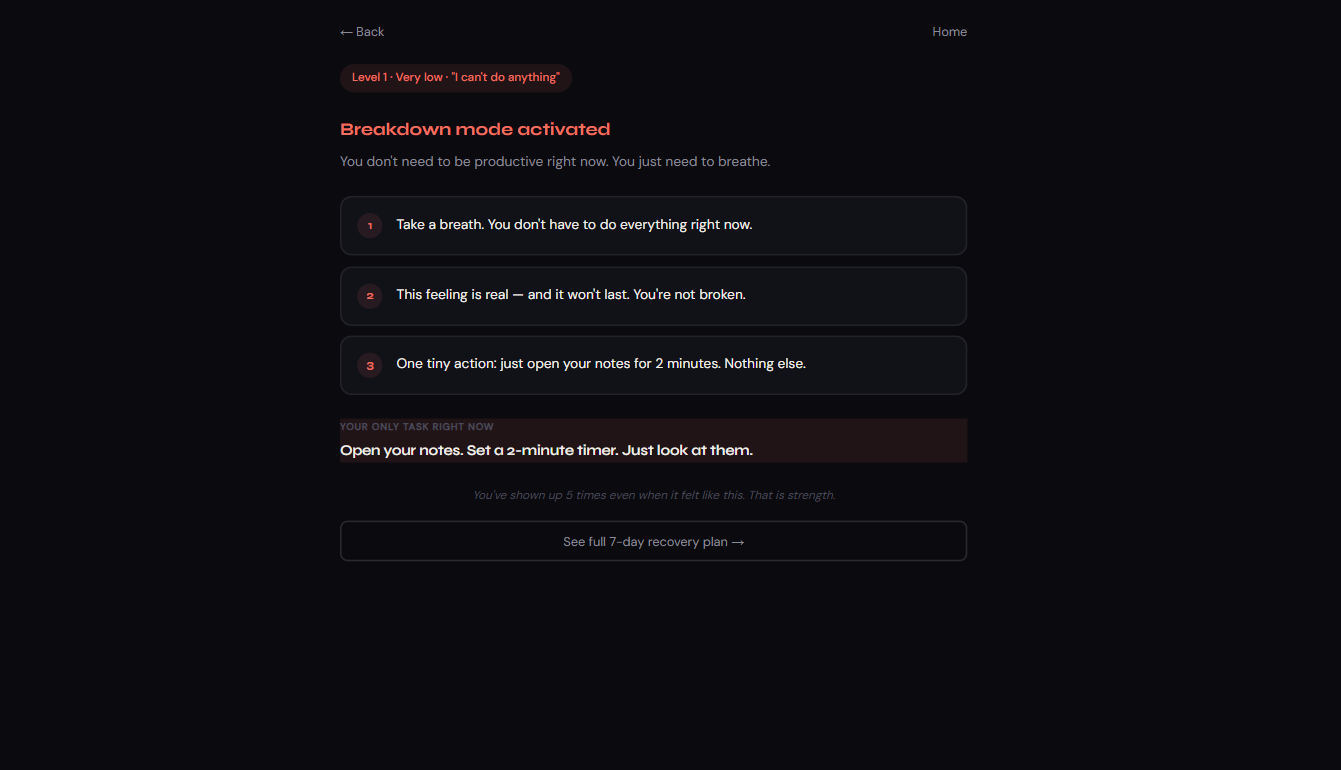 The most emotionally sensitive feature — triggered when a user selects "I can't do anything." Instead of tasks, the app delivers a 3-step human-first response: