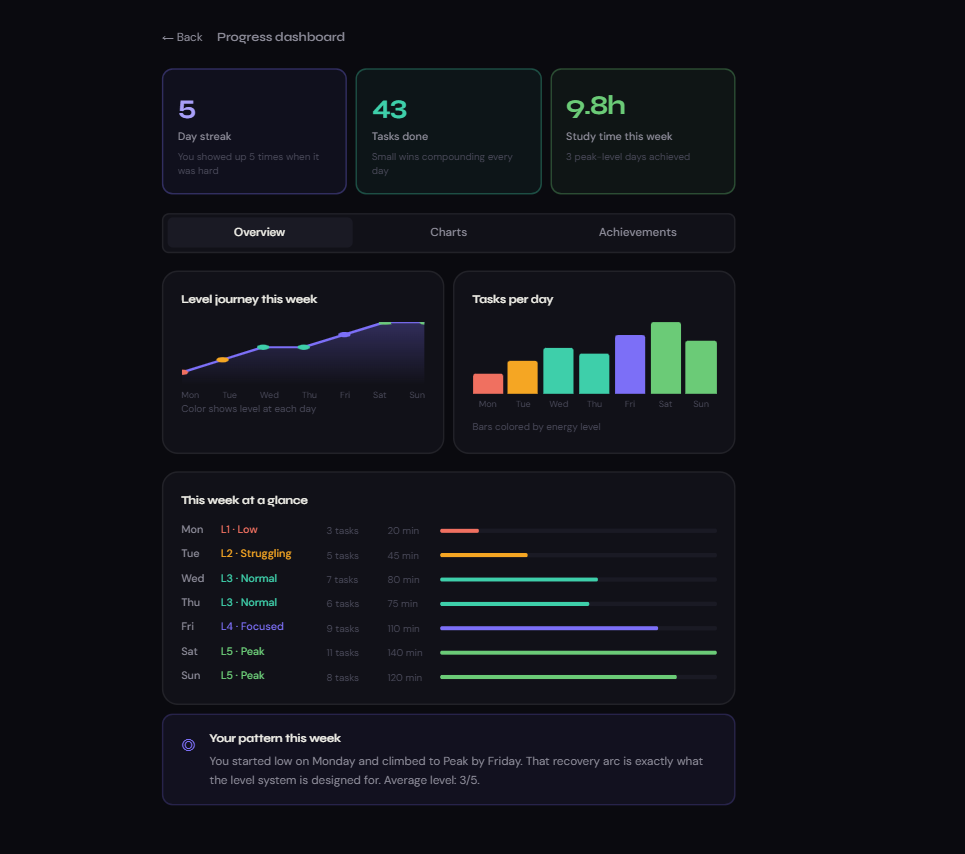 This is why a student at Level 1 can't simply be given harder tasks — their \( \lambda \) is high, and the system needs to reduce friction, not increase it. The level recovery system in StudyCoach is directly inspired by this model.