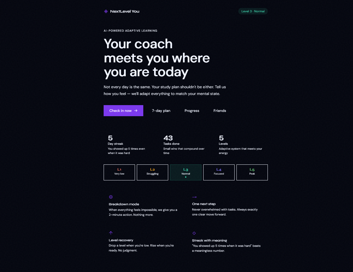 The core innovation is the Level Recovery System — an adaptive engine that reconfigures the entire app based on the student's current mental state: