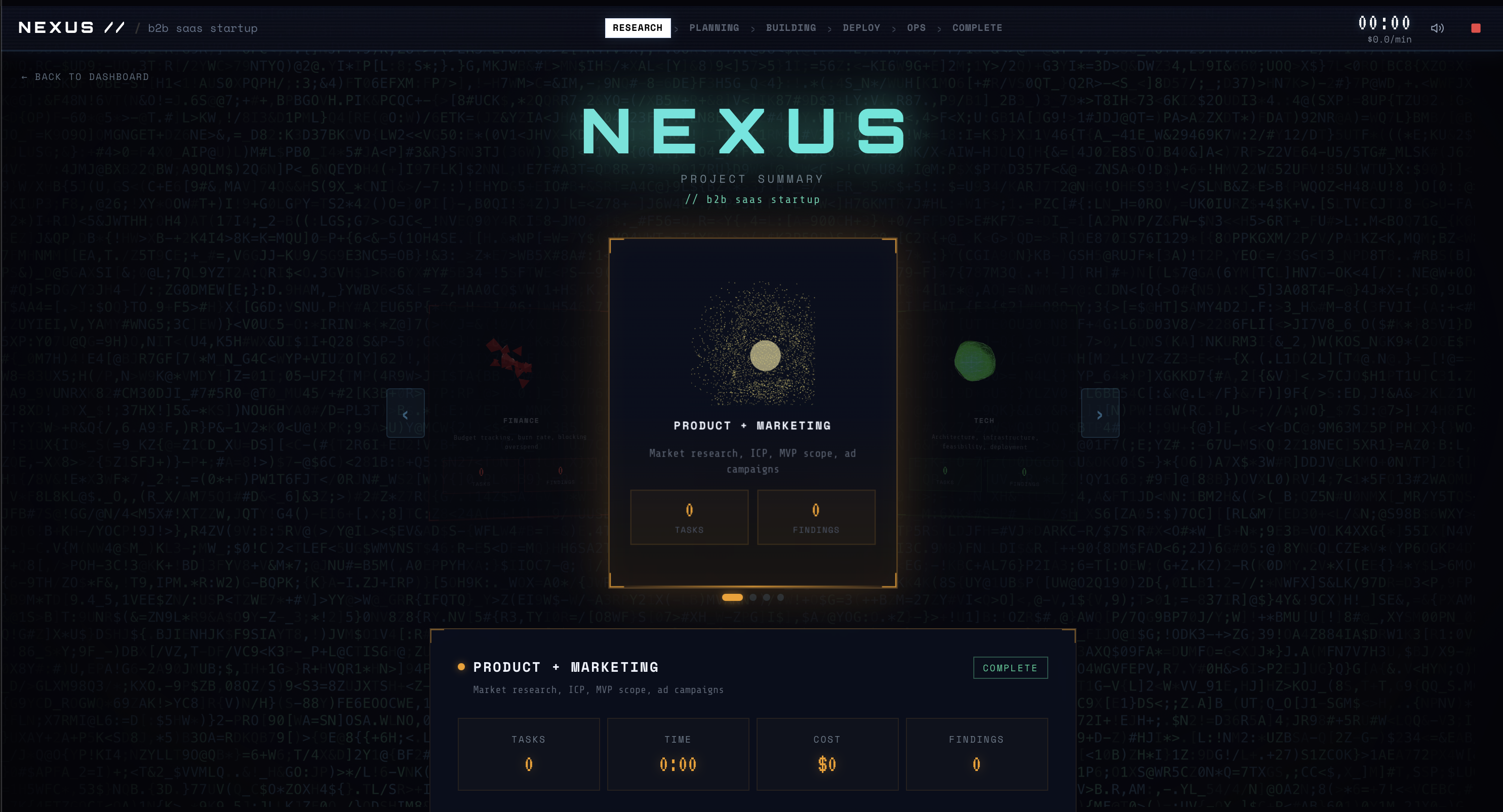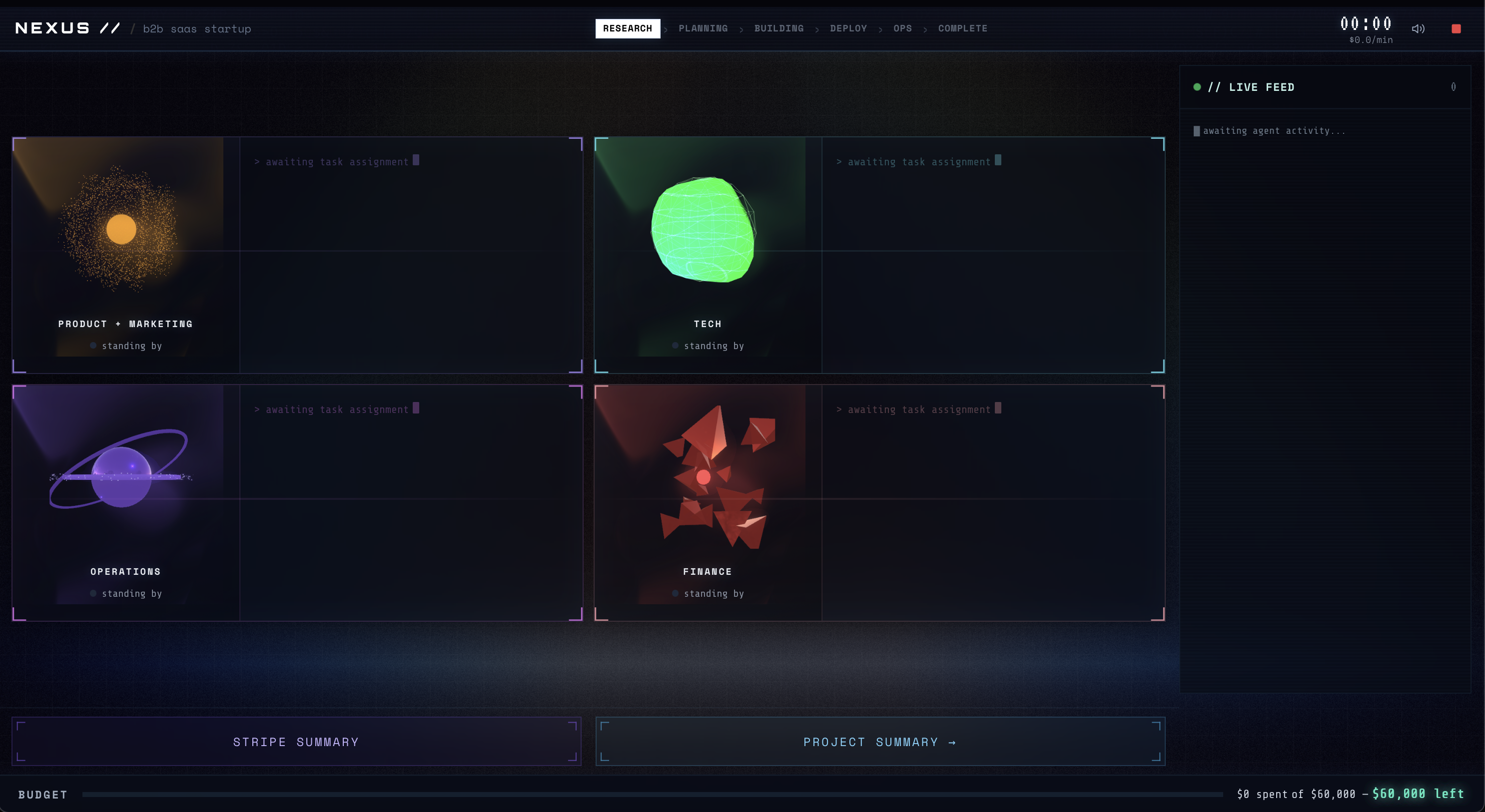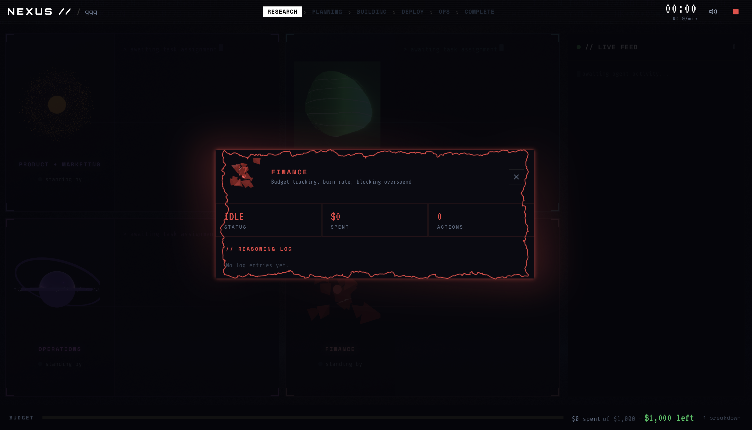 NEXUS is a real-time multi-agent startup simulator. You provide a startup idea and a budget. Five AI agents take structured roles and move through clear phases: Research → Proposal → Debate → CEO Decision → Execution. Every approved decision mutates the budget, changes strategy, and has visible financial impact