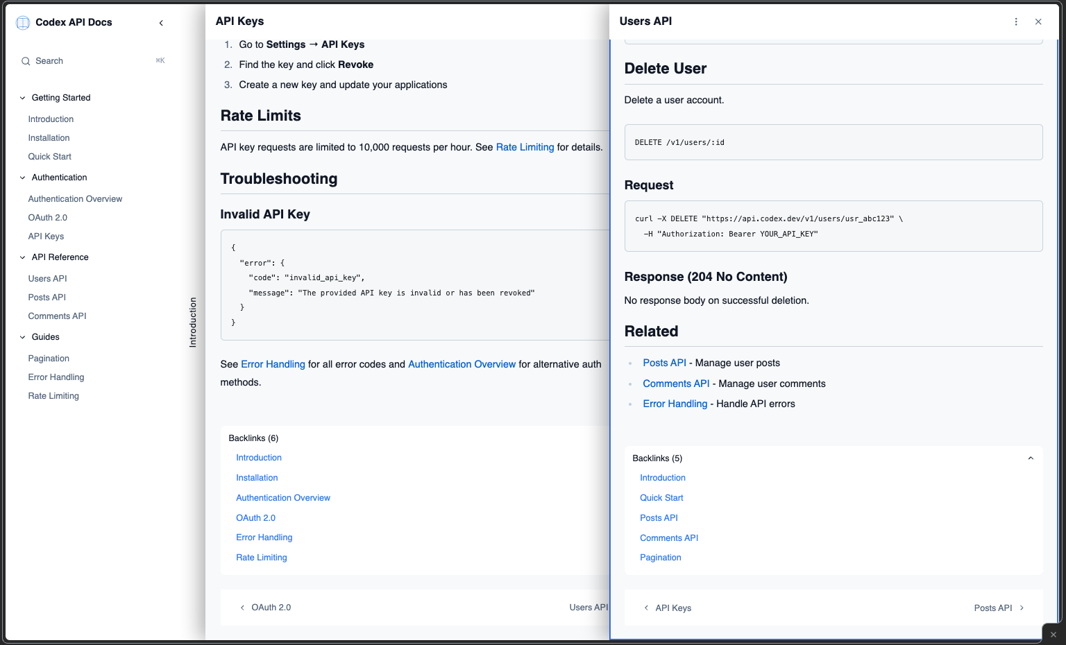| Horizontal | Click [[link]] → new pane opens right, previous stays visible | Exploring connections |
