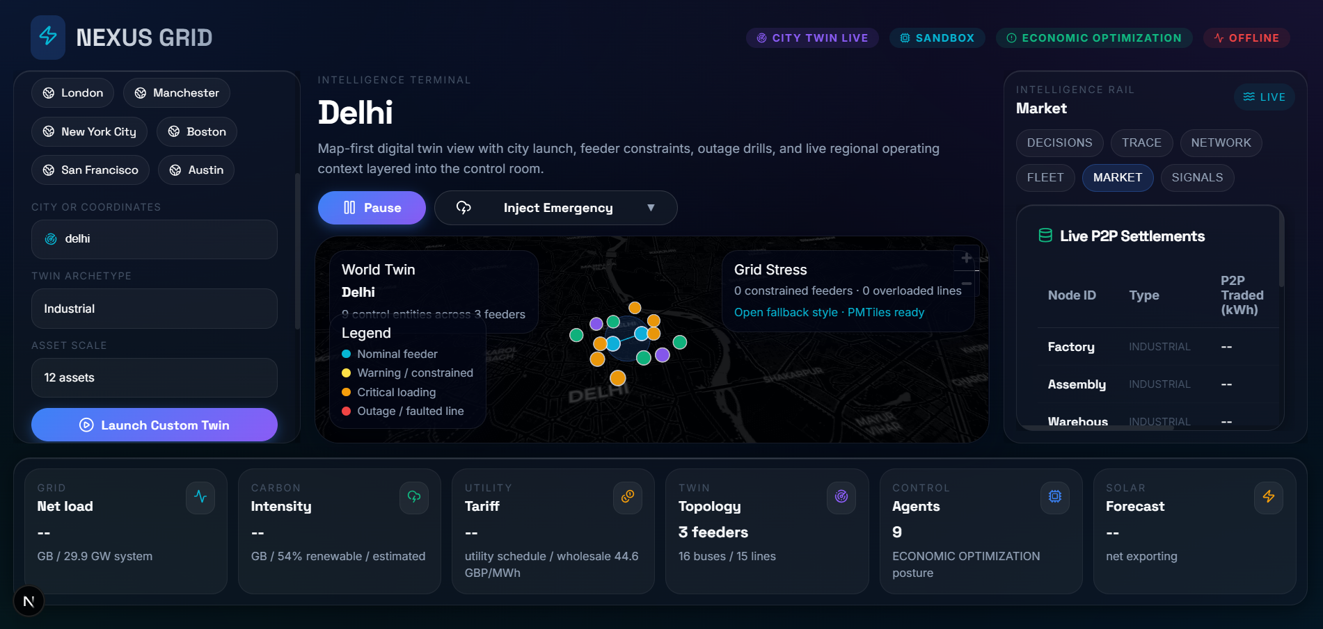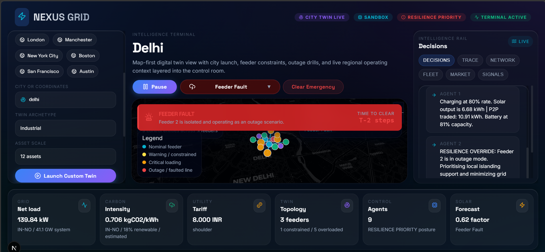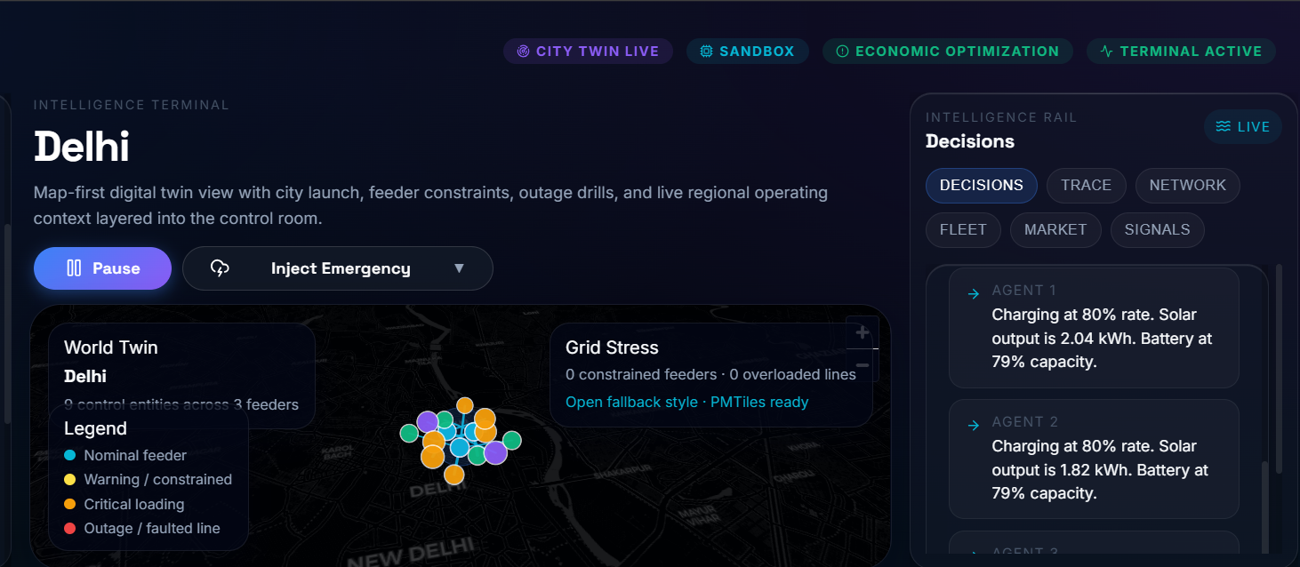 Instead of building just another dashboard, we built an autonomous mathematical brain. You provide the coordinates, and Nexus Grid instantly translates any district (like Ghaziabad, New York, or London) into an executable digital twin. It injects live macro-grid telemetry (carbon intensity, market pricing, solar forecasts) and unleashes a swarm of continuous-state Reinforcement Learning (RL) agents to balance the grid in real-time.