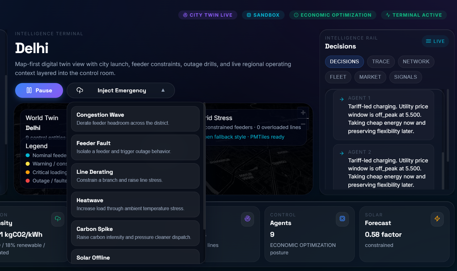 - Mathematical Resilience: Seeing our untrained agents successfully adapt to a manually injected "Emergency Feeder Fault" during a Chaos Drill, reroute power, and stabilize the district in real-time.