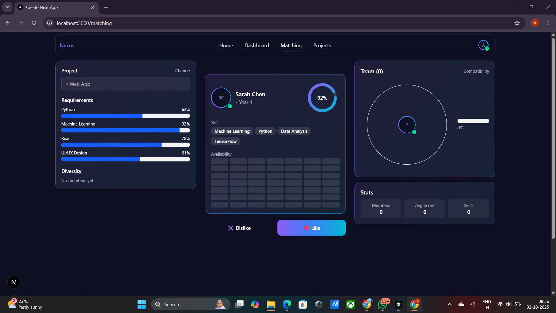 - Calculates real-time compatibility scores (0-100%)