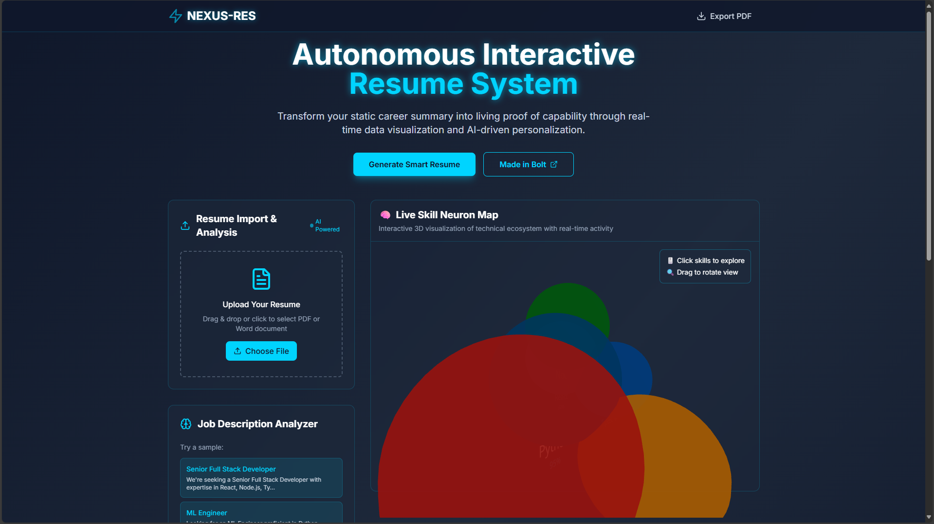 NEXUS-RES represents a paradigm shift from traditional static resume formats to a dynamic, data-driven career visualization platform. The system transforms conventional career documentation into an interactive, AI-powered ecosystem that provides real-time validation of professional capabilities through immersive data visualization and intelligent analysis.