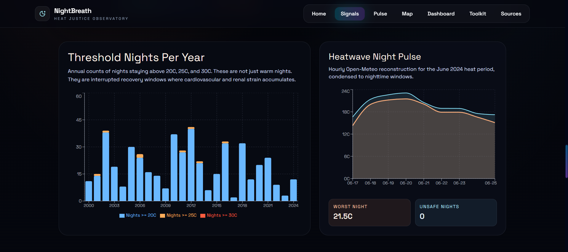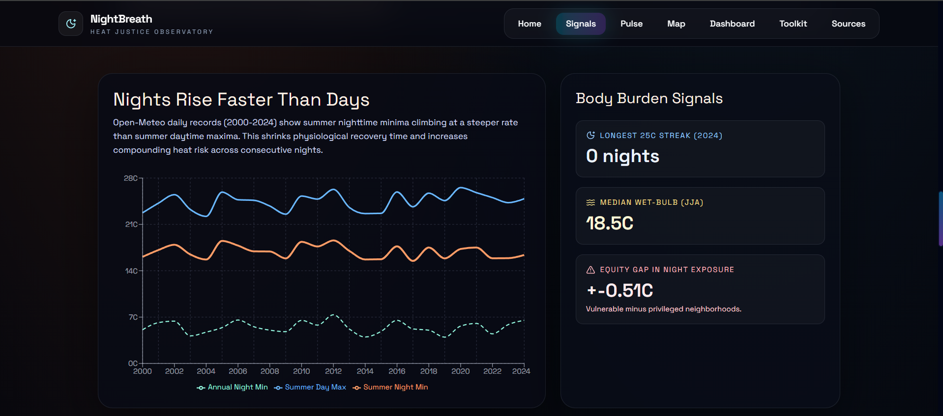 We built a night-first climate tool. In a world of daytime heat dashboards, NightBreath focuses on the hours when people actually die.