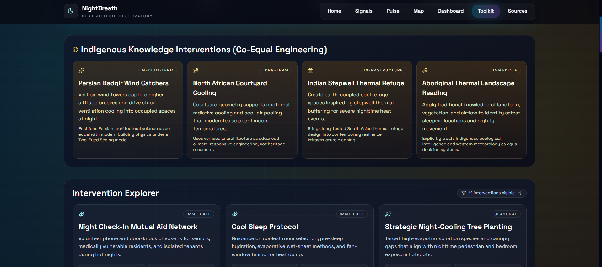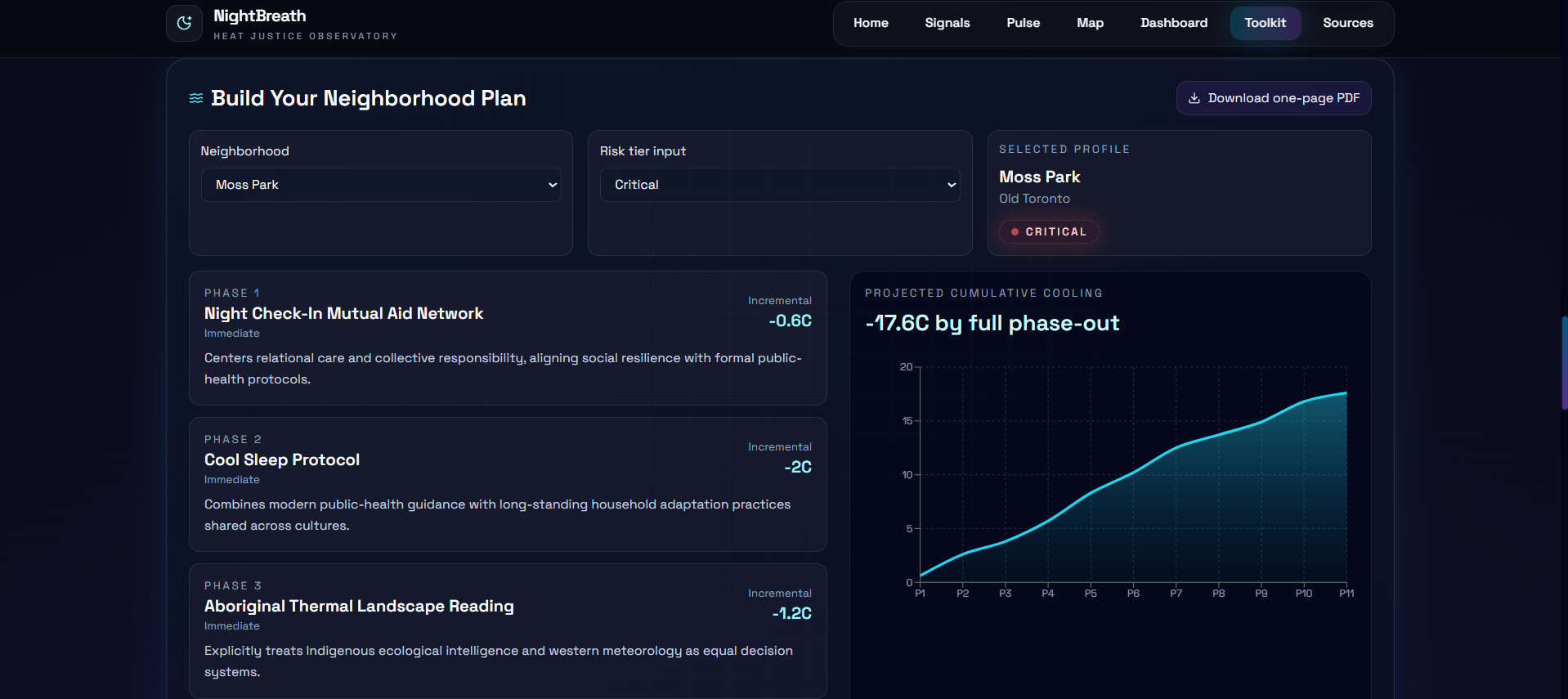 Every module produces actionable output. The toolkit generates phased 90-day implementation roadmaps with specific milestones. The PDF brief exporter creates documents designed to be handed to decision-makers. Interventions span from zero-cost mutual aid deployable tonight to infrastructure investments over years. A city pilot could begin with \$200 worth of temperature loggers and a neighborhood volunteer network.