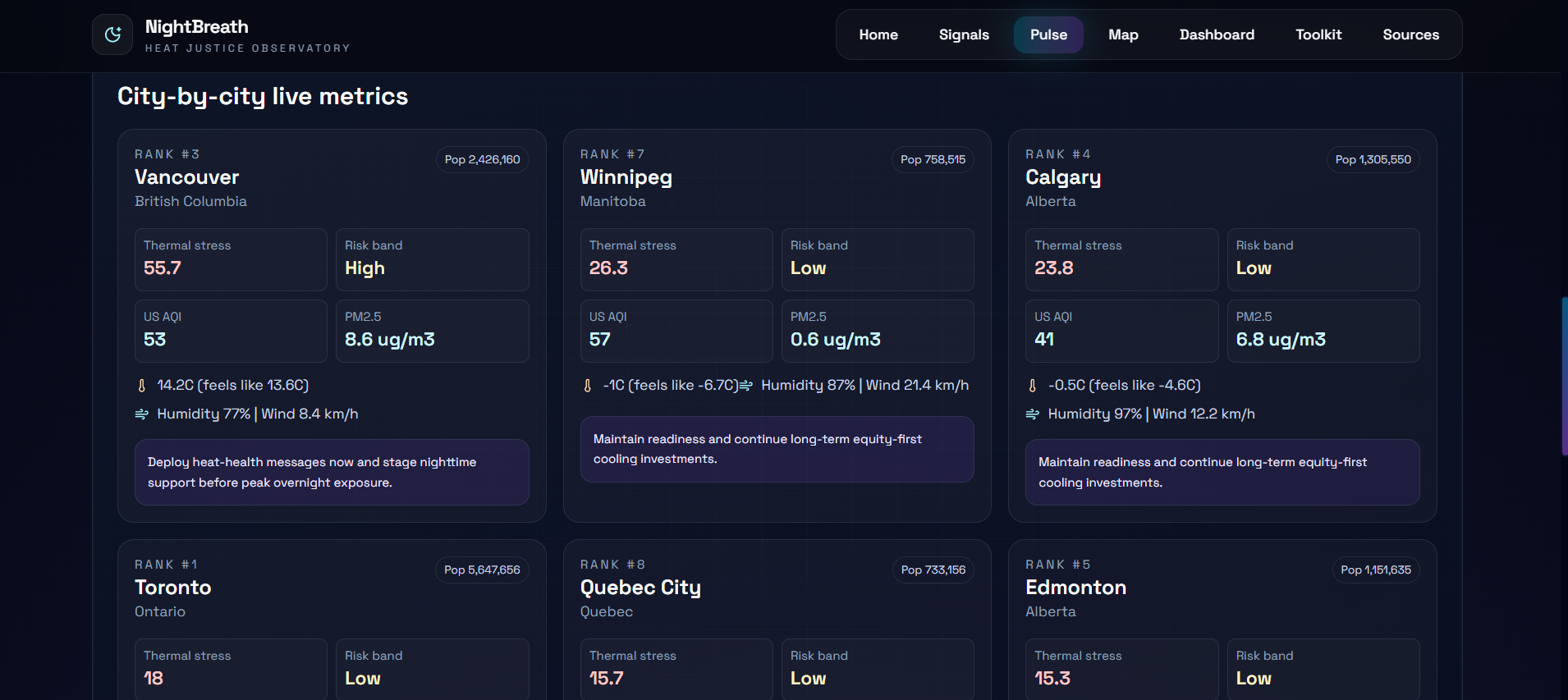 A real-time thermal stress tracker for major Canadian cities, pulling live data from Environment and Climate Change Canada (ECCC GeoMet) and Open-Meteo. Shows current nighttime conditions, active alerts, and comparative risk across regions. Because this crisis is not limited to Toronto.