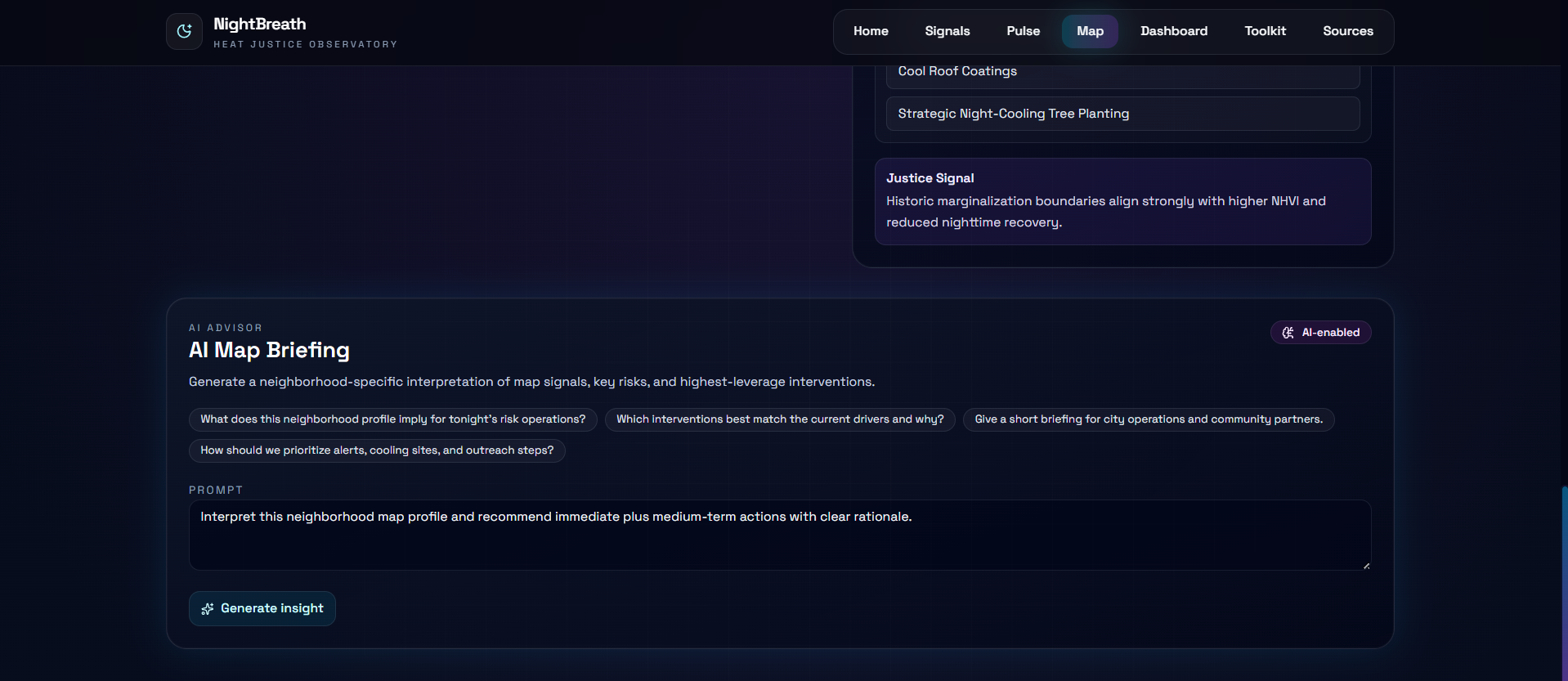 The Systems Trade-Off Watchlist is critical: will adding green infrastructure drive up property values and displace the people it was meant to protect? Will cool roof programs reach renters or only homeowners? NightBreath flags these risks before any decision is made.