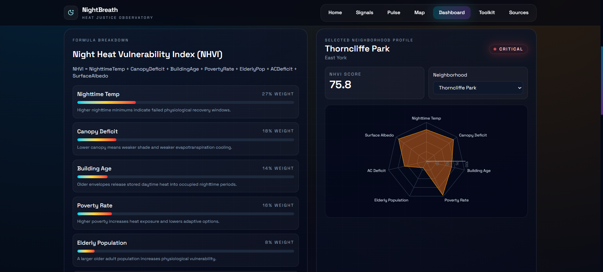 The Night Heat Vulnerability Index is a weighted composite score (0-100) that quantifies each neighborhood's nighttime heat risk: