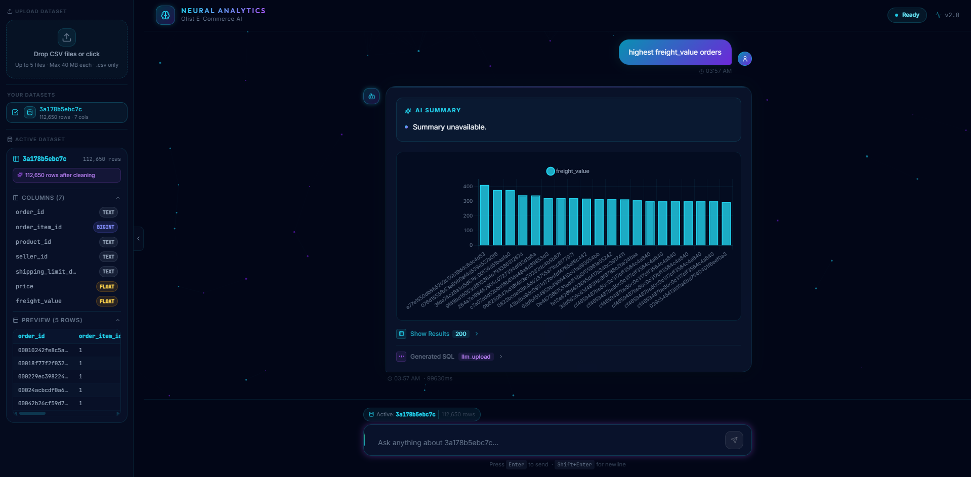 ✅ Zero-SQL querying — LLM generates correct SQL for arbitrary CSVs, with semantic column retrieval ✅ Multi-table JOINs — User can select 2–5 datasets and chat queries them together automatically ✅ Production-grade safety — Strict SELECT-only, SQL injection guards, prompt injection detection ✅ Semantic schema search — FAISS + Cohere embeddings reduce prompt size while improving relevance ✅ Graceful degradation — Falls back to text-only schema context if Cohere embedding fails ✅ Real-time feedback — Per-file upload progress, auto-cleaning report, chart auto-selection ✅ Modular architecture — 5 clean backend modules (file_handler, schema_inferer, data_cleaner, table_creator, dynamic_retriever), 8+ reusable React components ✅ Auto-fix on failure — LLM corrects broken queries without user intervention