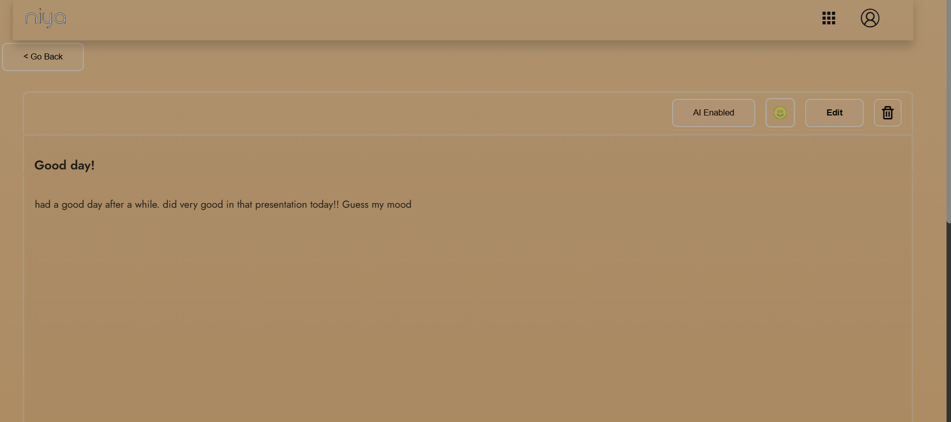 Niya provides an AI-driven summarization feature that analyzes entries in the journal, establishes recurring themes, and the emotional patterns. This insight would allow users to gain deeper understanding of their mental health journey.