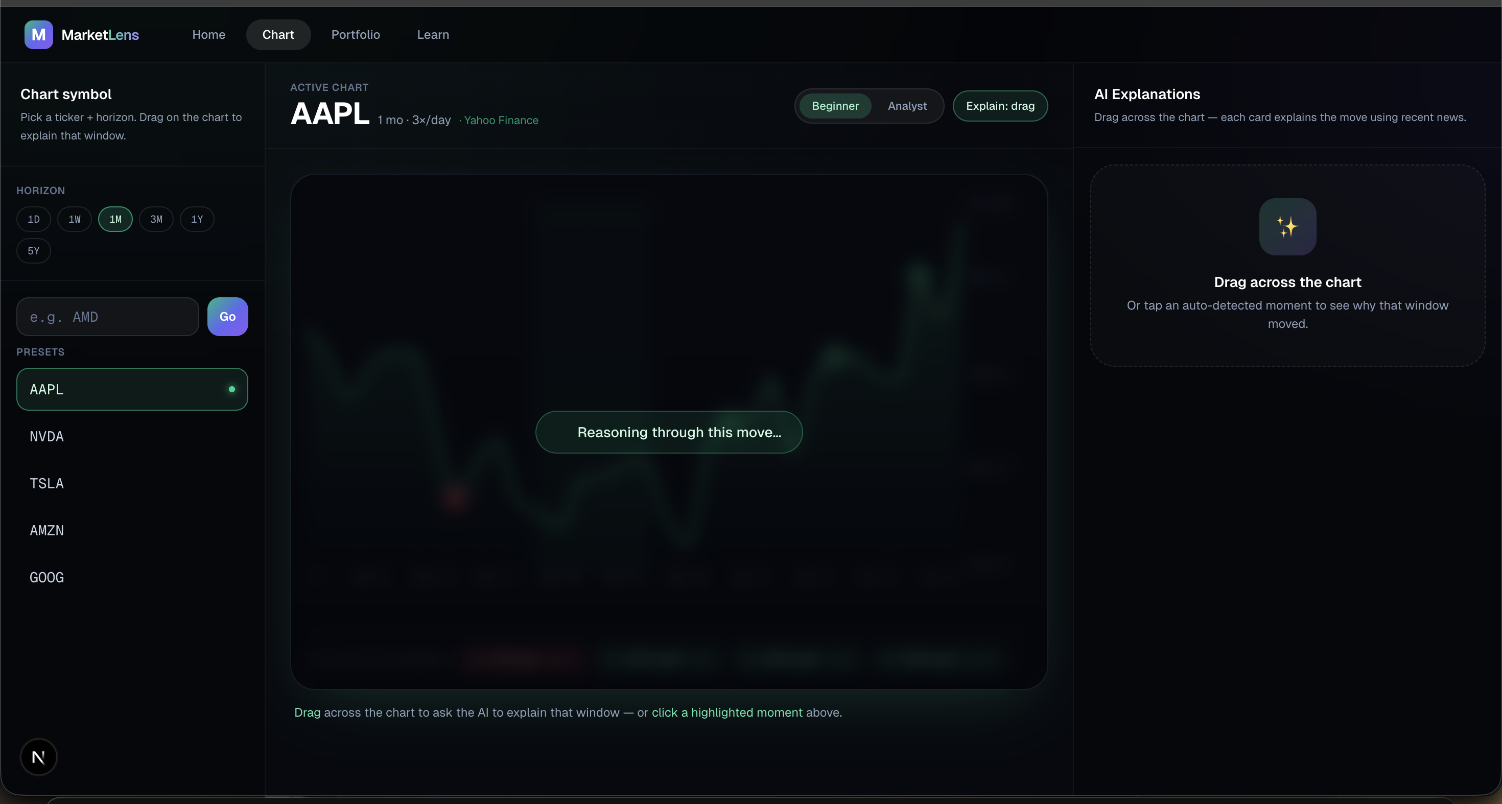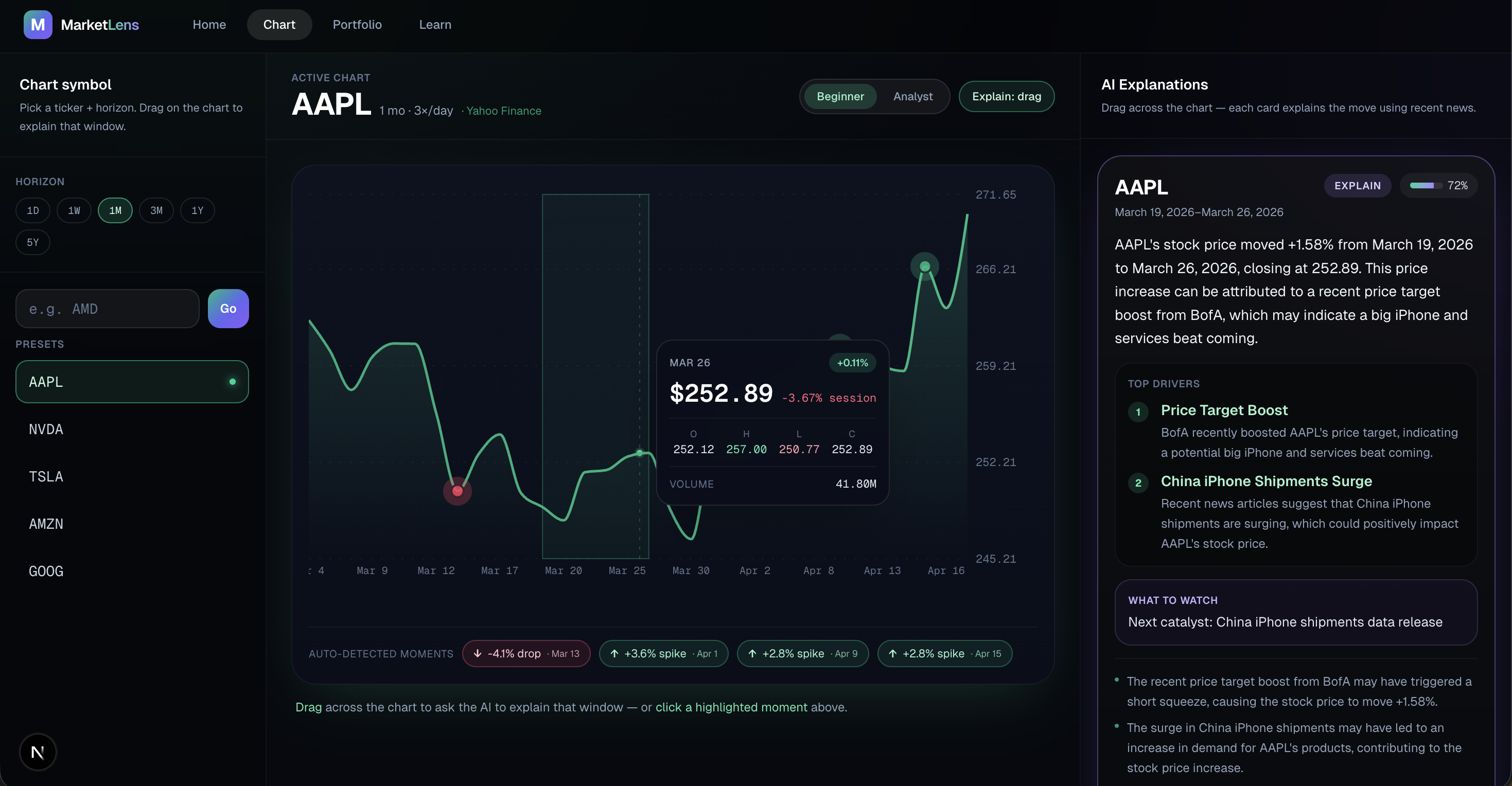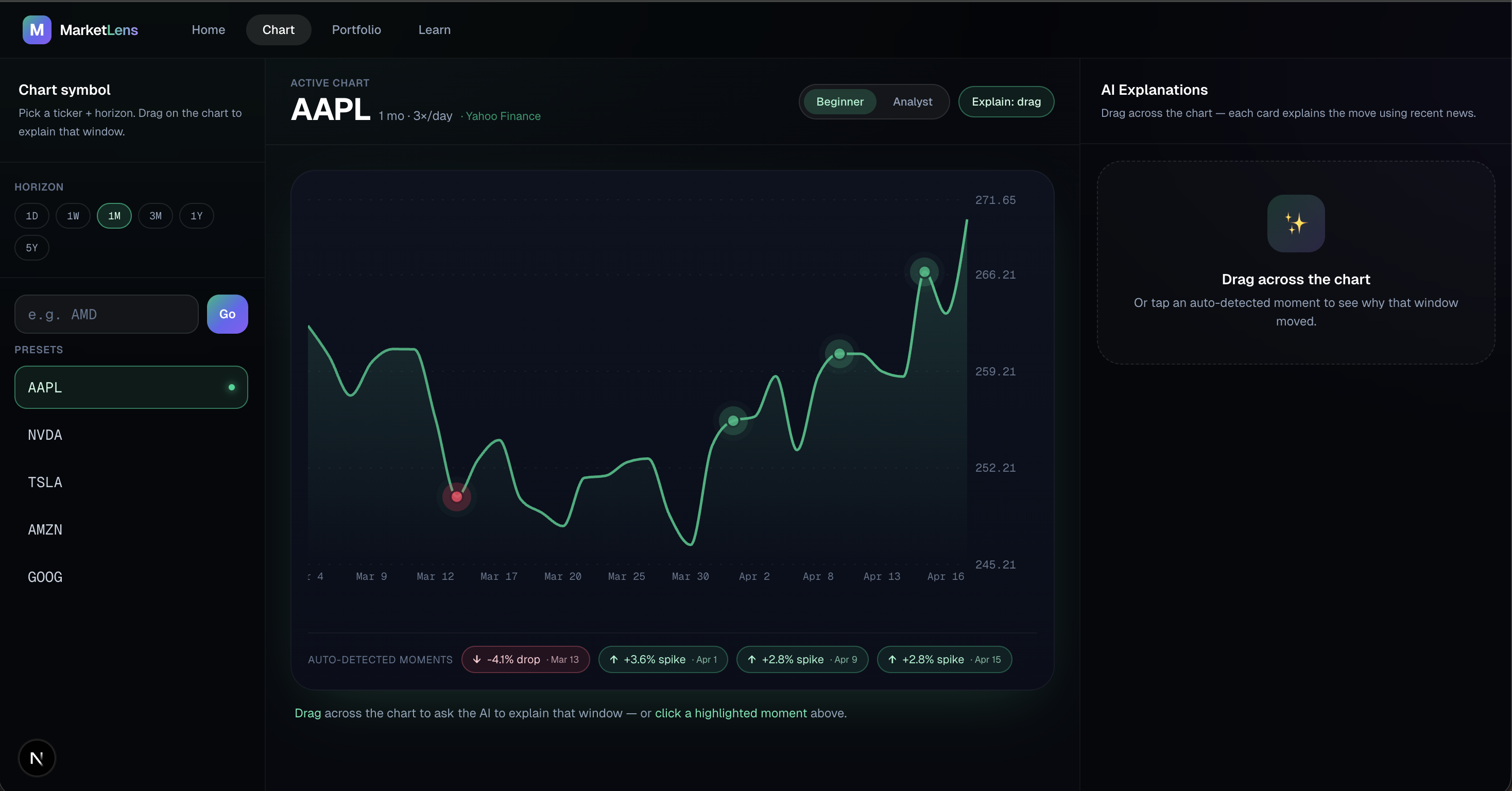 - Pick a ticker, choose a horizon, drag a price window — get an AI explanation grounded in real headlines, in beginner or analyst tone.