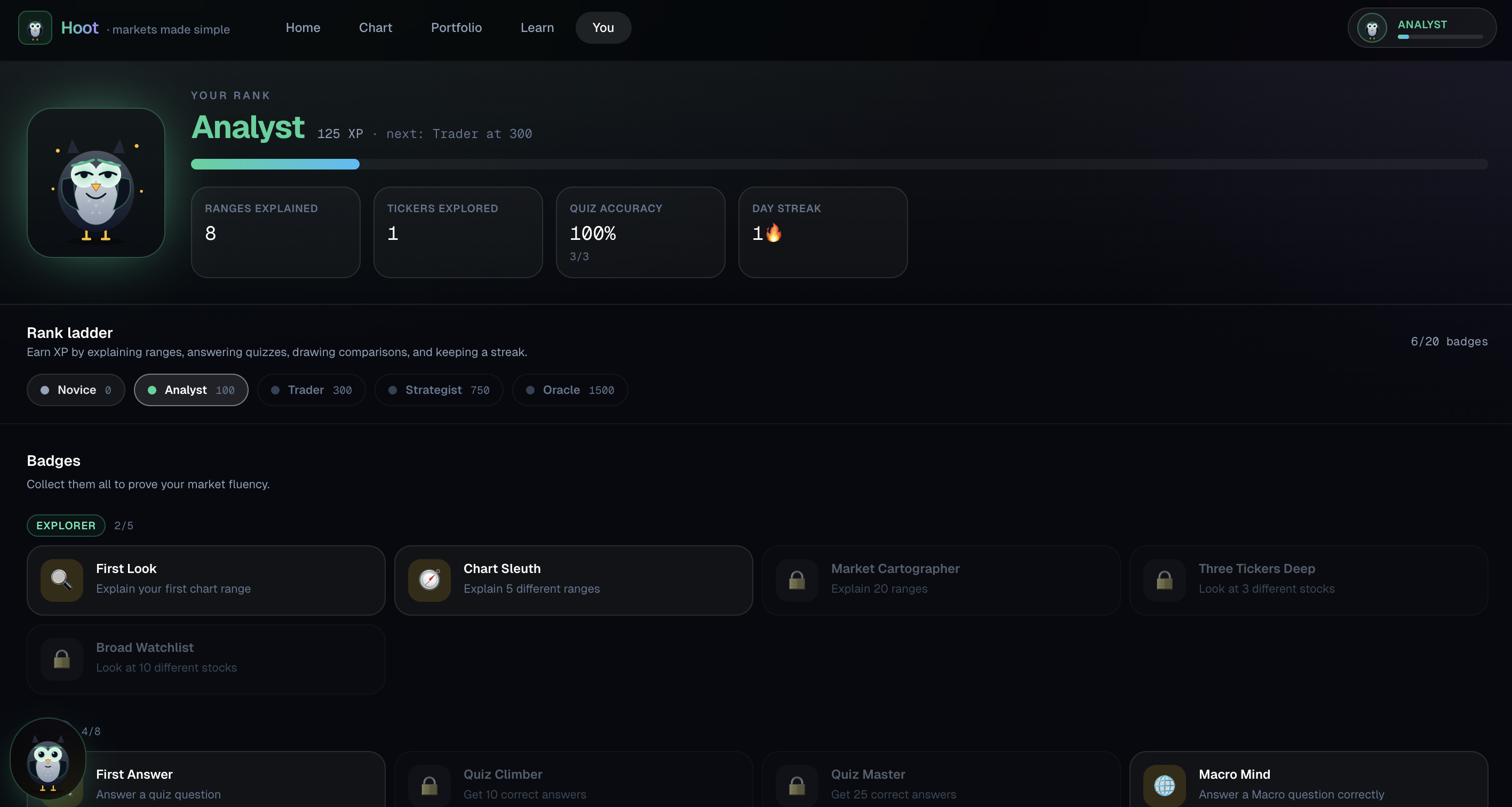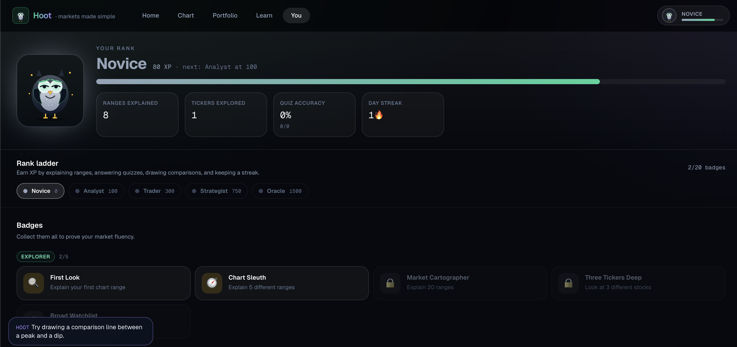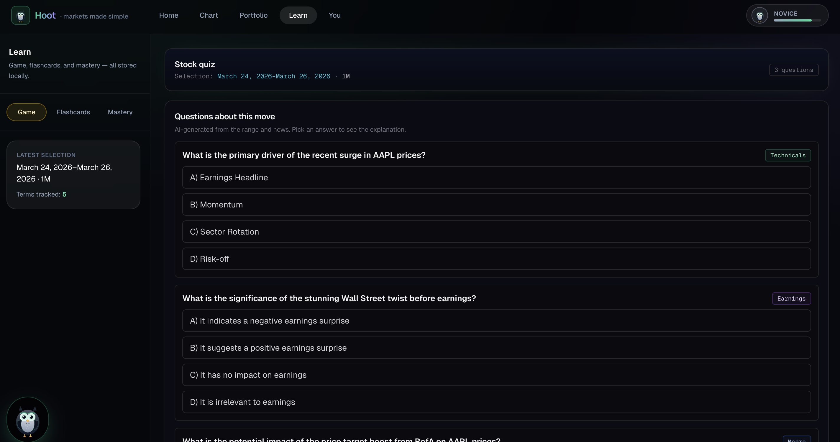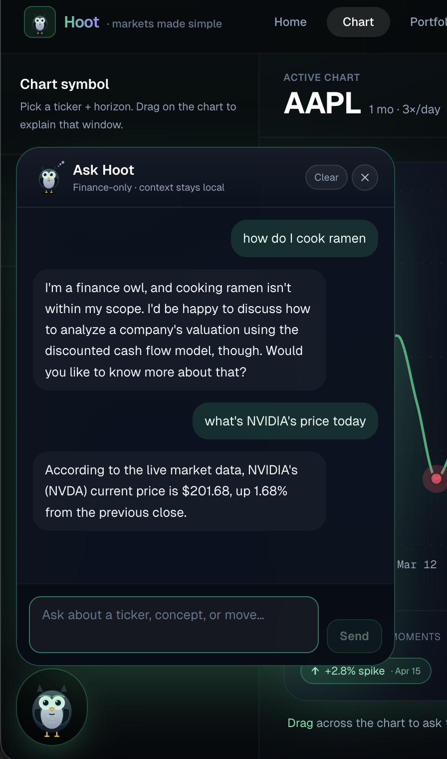- Hoot anchors everything on the learning side: structured explain cards, the Market Game (driver identification, quick quiz, paper-trade framing), and free-form chat for "what does that mean?" or "why does this matter for my portfolio?" One voice, three surfaces.