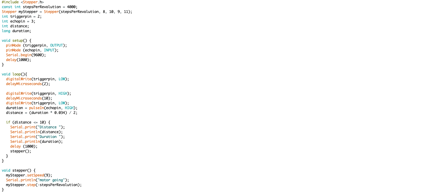 So, each of the pins except the ground and vcc on the motor driver are connected to pins on the arduino, which we defined in the code. The trigger and echo pin on the sensor are also connected to the arduino which are defined in the code. Then the ground and vcc of both the motor and the sensor are connected to the ground and vcc of the arduino which is connected to the power. The sensor detects the distance by seeing how long it takes a wave to come back. The code on the arduino makes sure that if the sensor detects something within 10 centimeters of it, it runs the function stepper which causes the motor to run. The container is made from the lysol container, hopefully making it cheaper for developing countries. The container has two holes, one for the wipes to come out from and one for the motor. Then we need to connect the motor to the container which I achieved with tape. The rod connects to the motor which is held on the other side through the hole already provided in the lysol container. Now when the motor rotates, the rod rotates as well.