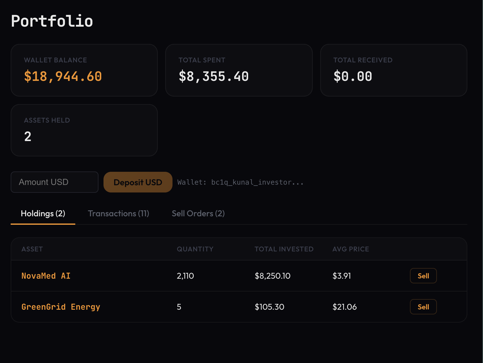 We built a working end-to-end trade flow: a shareholder lists tokenized shares → the AI inspector validates ownership and scores the company → an investor purchases with Bitcoin → a digital ownership certificate is generated automatically. All of this happens without a single bank, lawyer, or centralized intermediary. The risk scoring engine produces results that are genuinely interpretable to a retail investor, not just a risk analyst.