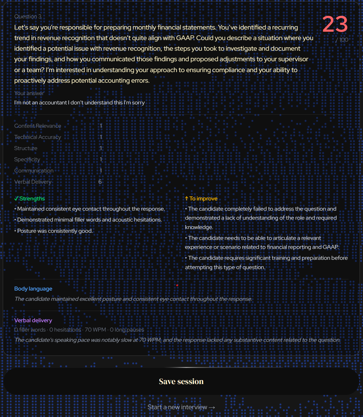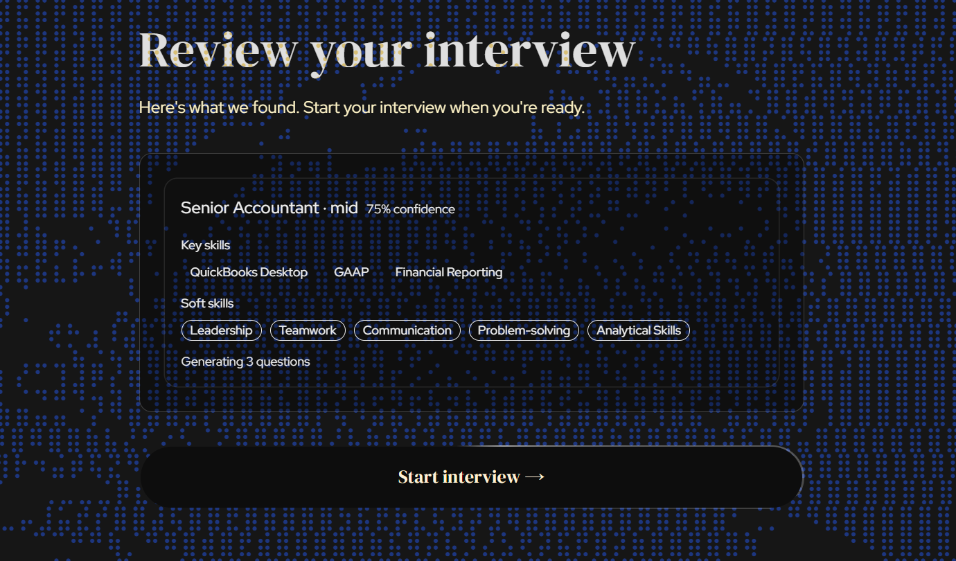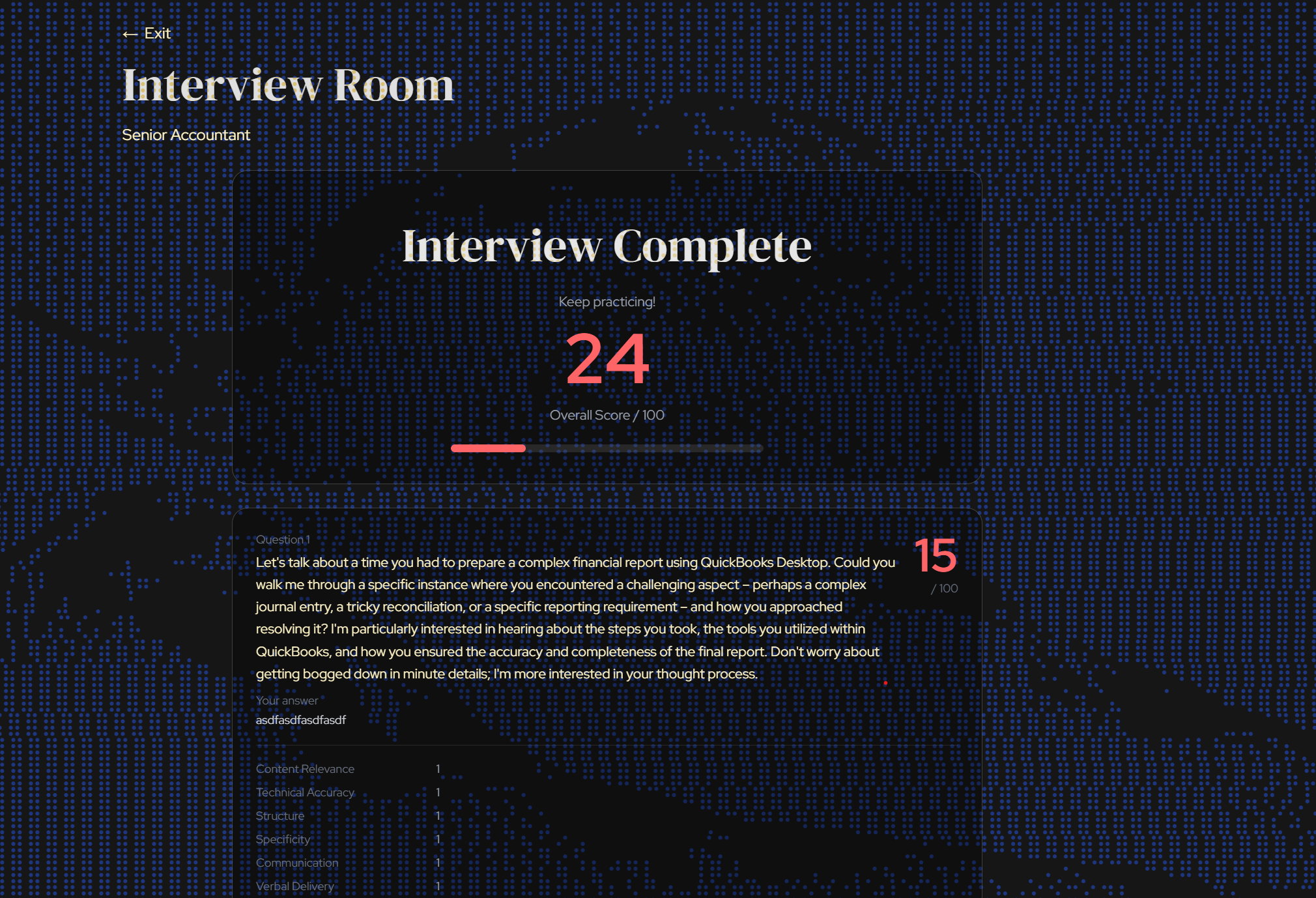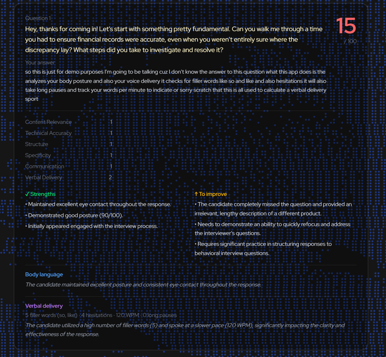 Shipping a full end-to-end interview product in 24 hours with voice, video, LLM scoring, and a persistence dashboard, with zero server-side video processing. The verbal delivery pipeline (filler words, speaking pace, pauses, and acoustic hesitations) runs entirely in the browser via Web Speech and Web Audio APIs, feeding directly into Gemma's scoring rubric as a named dimension alongside content and structure. The fallback system means the app degrades gracefully: no mic leads to typed answers, no camera skips CV, and TTS failure falls back to browser speech.