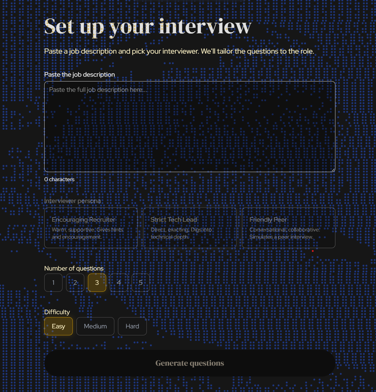 Longer term, we want a question bank organized by company, role, and difficulty, spaced repetition tracking so the app knows which competencies you consistently struggle with, and a mobile app so you can practice during a commute. The infrastructure is already minimal enough that most of this is a frontend and prompt engineering problem, not an architecture one.