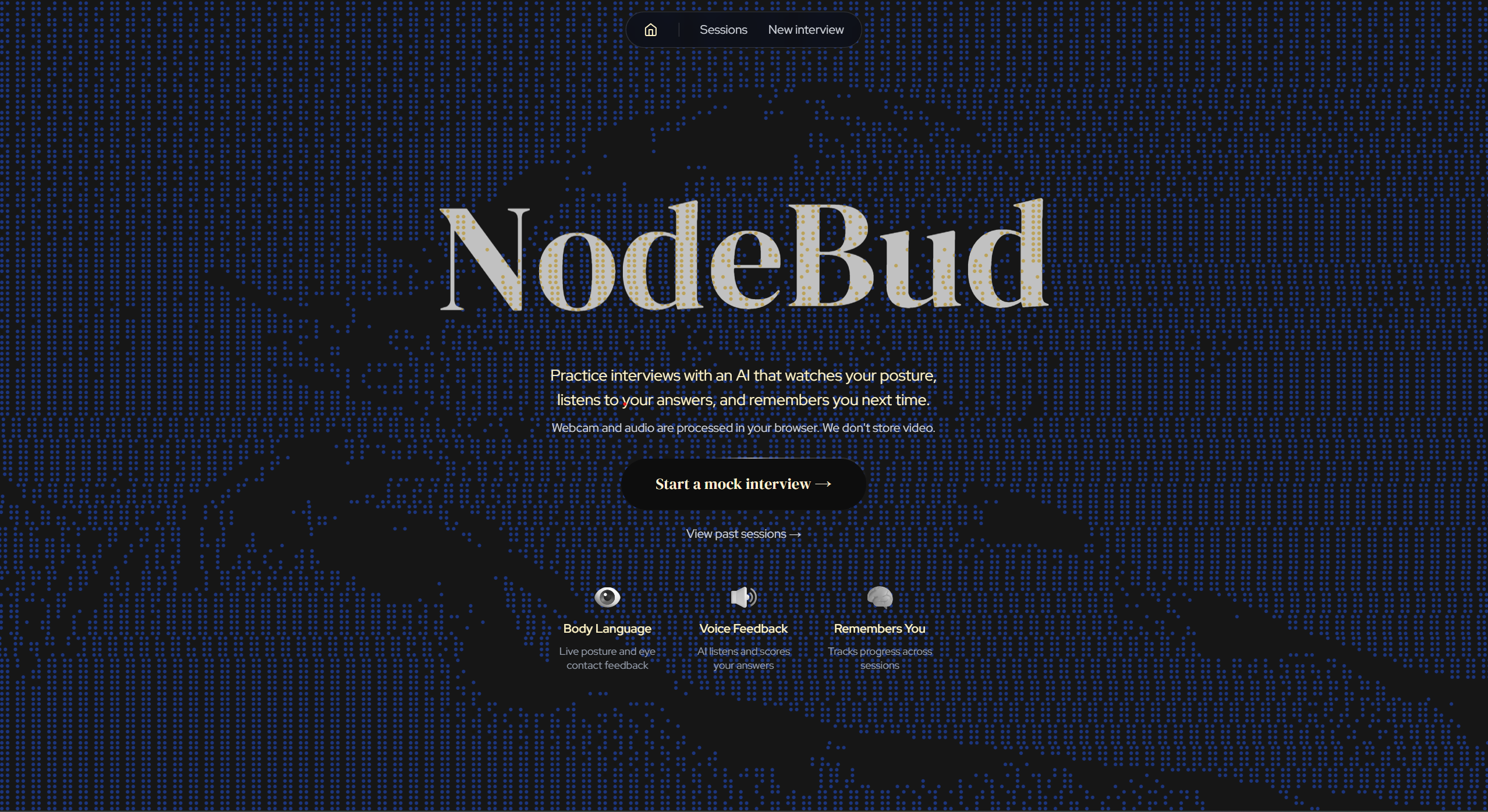 NodeBud AI conducts full AI mock interviews tailored to a job description you paste in. It listens to your answers, watches your body language through your webcam, and scores you across six dimensions: content, structure, technical accuracy, communication, verbal delivery, and non-verbal presence. After each interview you get a detailed score report with strengths, improvement notes, and a session dashboard that tracks your progress over time.