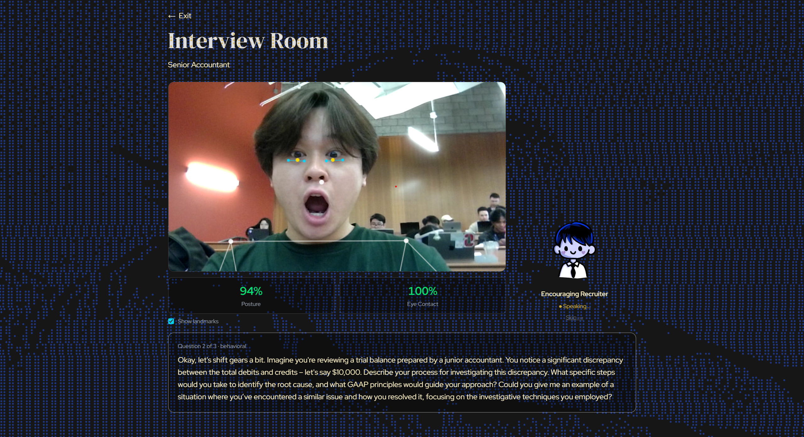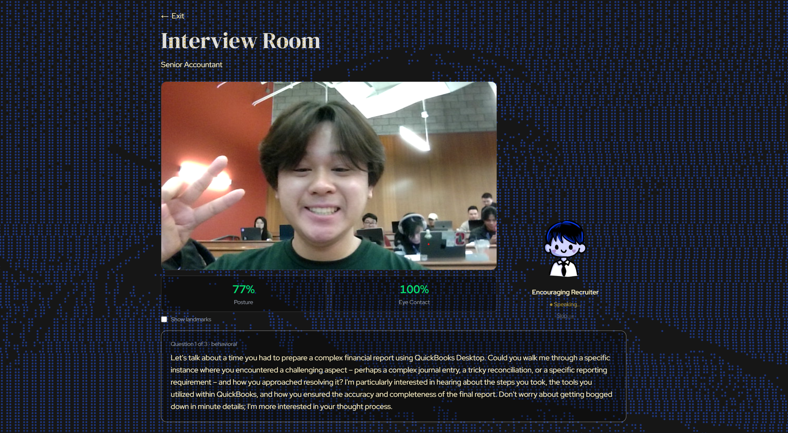 Mock interviews are expensive or awkward — career coaches cost money, and asking a friend feels uncomfortable. We wanted to build something that gives every student honest, private feedback on both what they say and how they present themselves, available anytime from a browser.