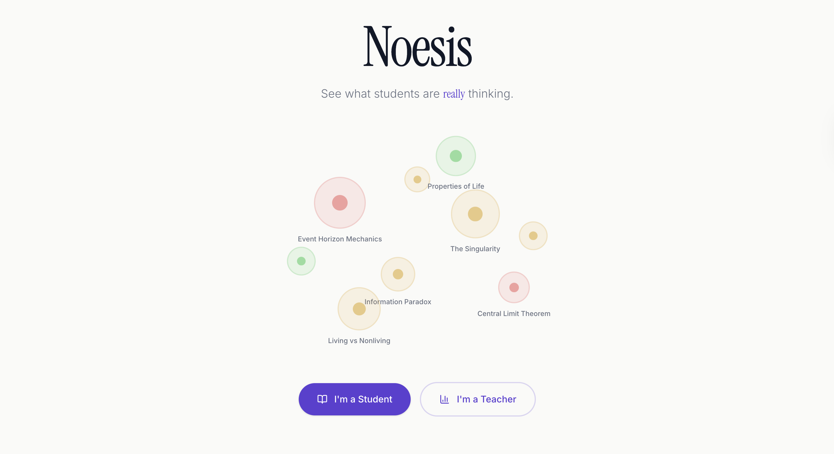 Noesis is a sense-making platform that organizes and thematizes student ideas in real-time. By analyzing student notes and reflections, it generates an anonymous thematic heatmap that allows teachers to see cognitive patterns across the room. Unlike evaluative tools, it preserves the student's original language and gives them "interpretive authority" through a self-classification step. It identifies "dissonance points"—moments where a student's self-reported confidence differs from the AI's semantic analysis—allowing teachers to intervene exactly when a student might have a false sense of mastery.