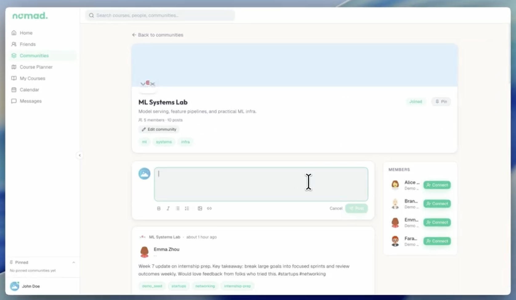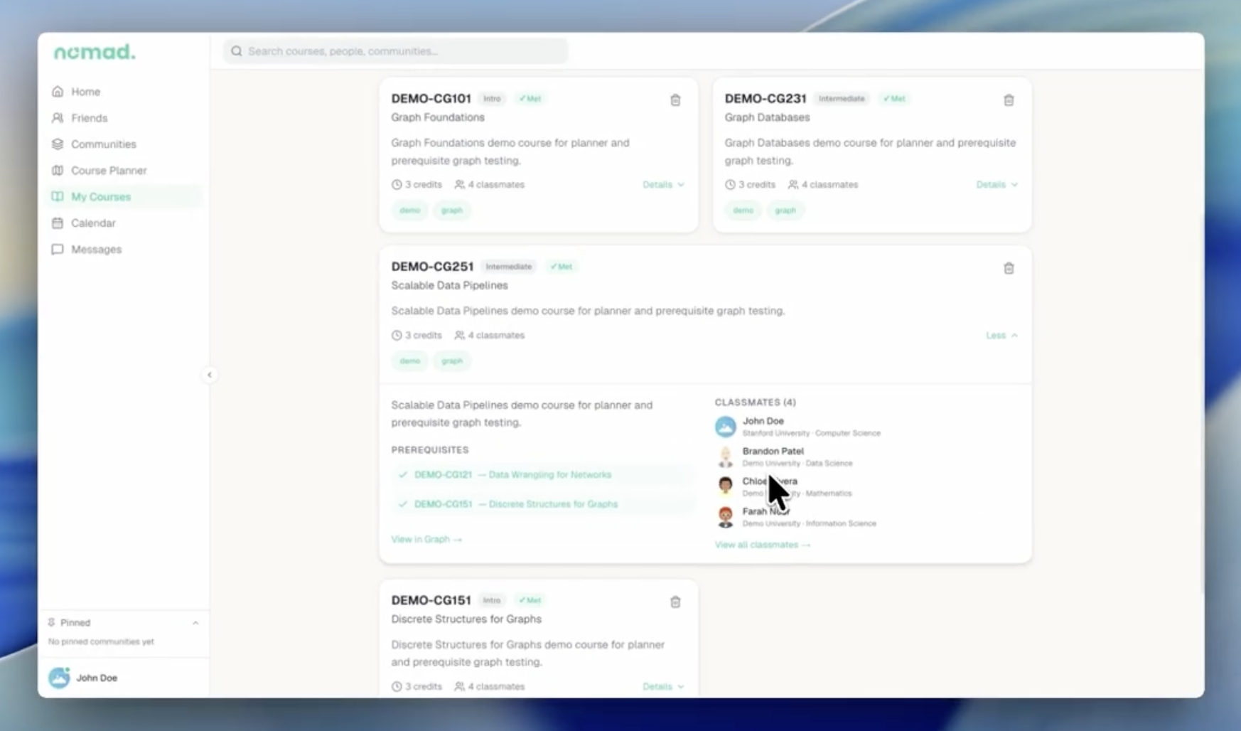 Nomad was built to address this gap by combining academic planning and social discovery into a single system. The core idea is that a student’s academic graph and social graph are inherently linked, and should be treated as such.