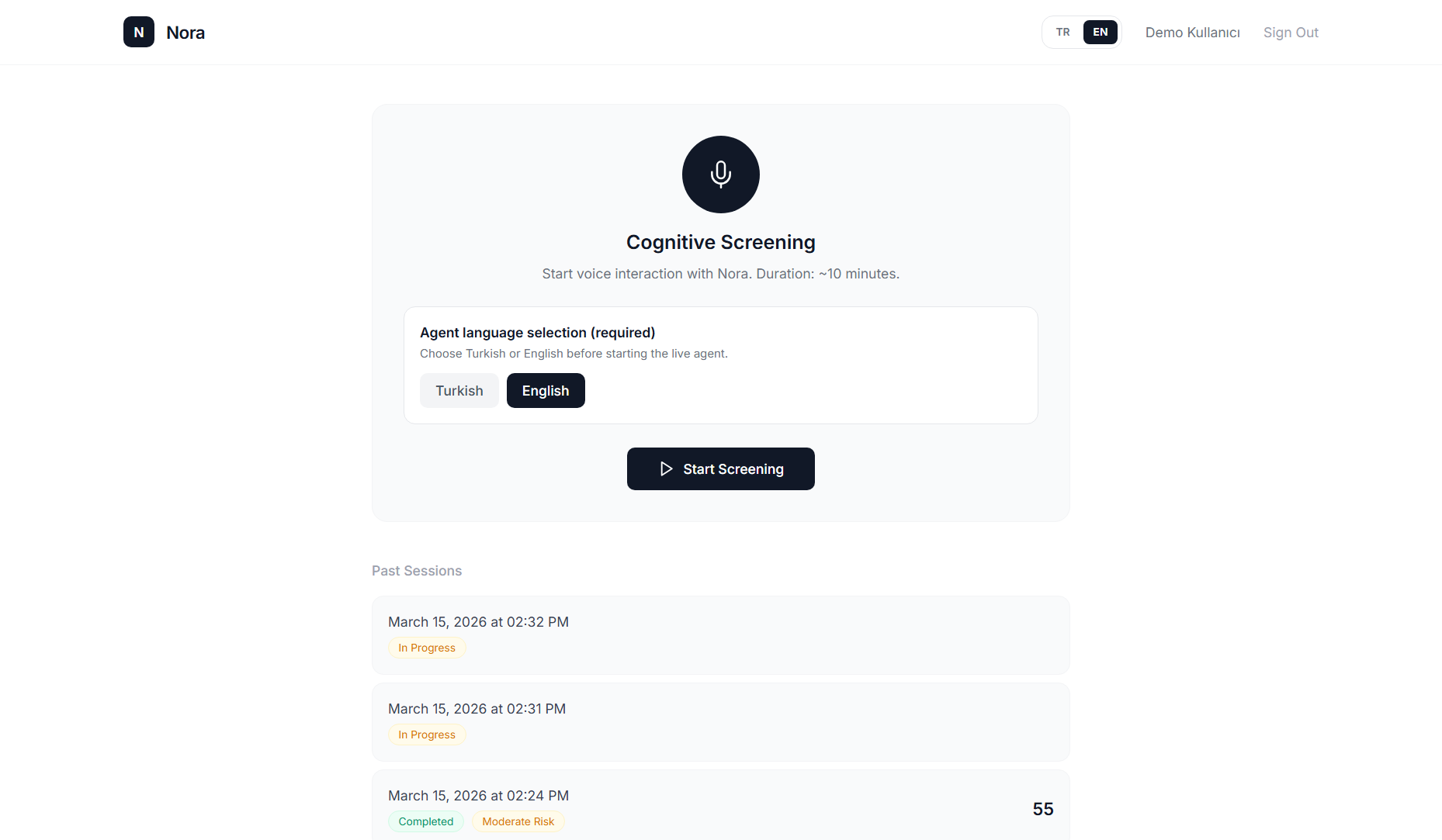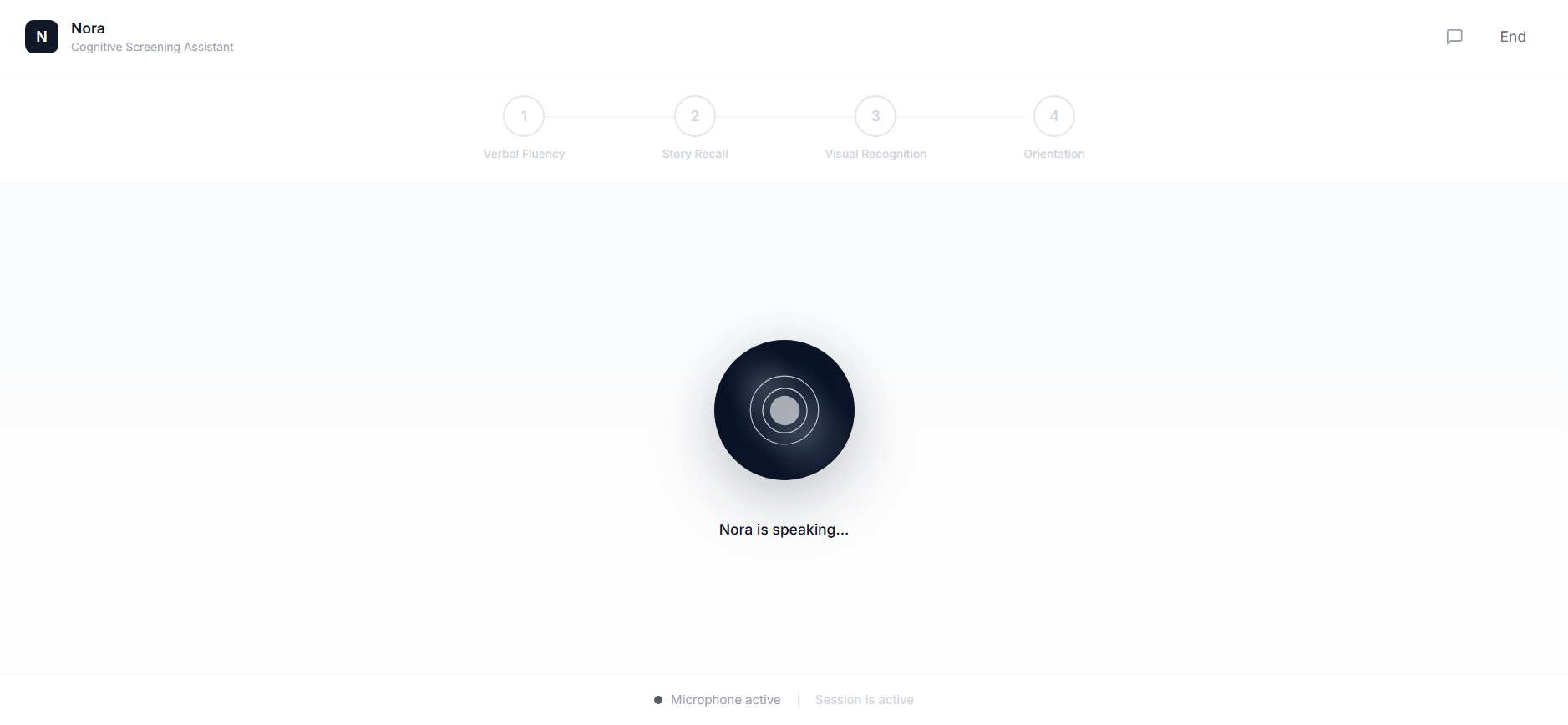Nöra is an autonomous voice AI agent that conducts a structured cognitive screening session with the user through natural, real-time conversation. It administers 4 clinically-inspired cognitive tests: