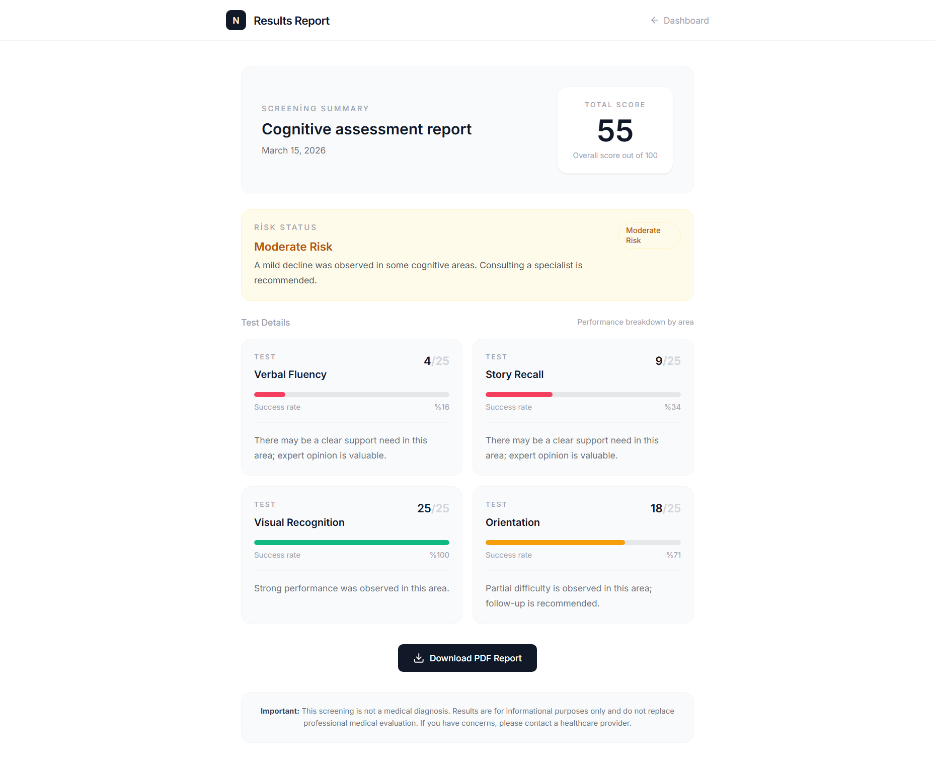 At the end of the session, Nöra algorithmically produces a risk assessment score and a detailed, downloadable PDF report with per-test breakdowns.