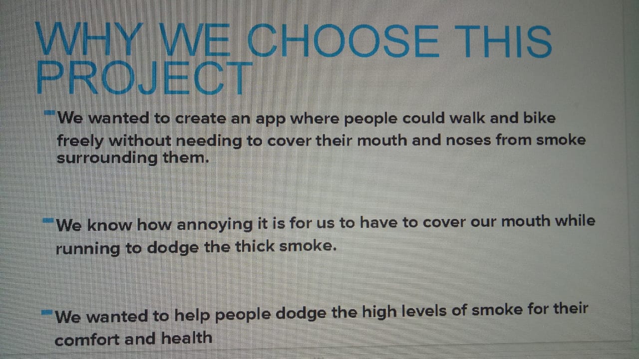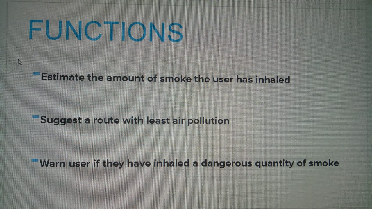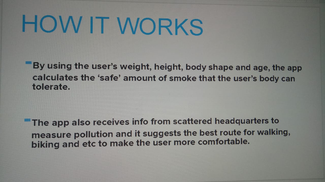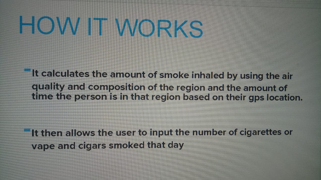 It calculates the amount of smoke inhaled by using the air quality and composition of the region and the amount of time the person is in that region based on their gps location.