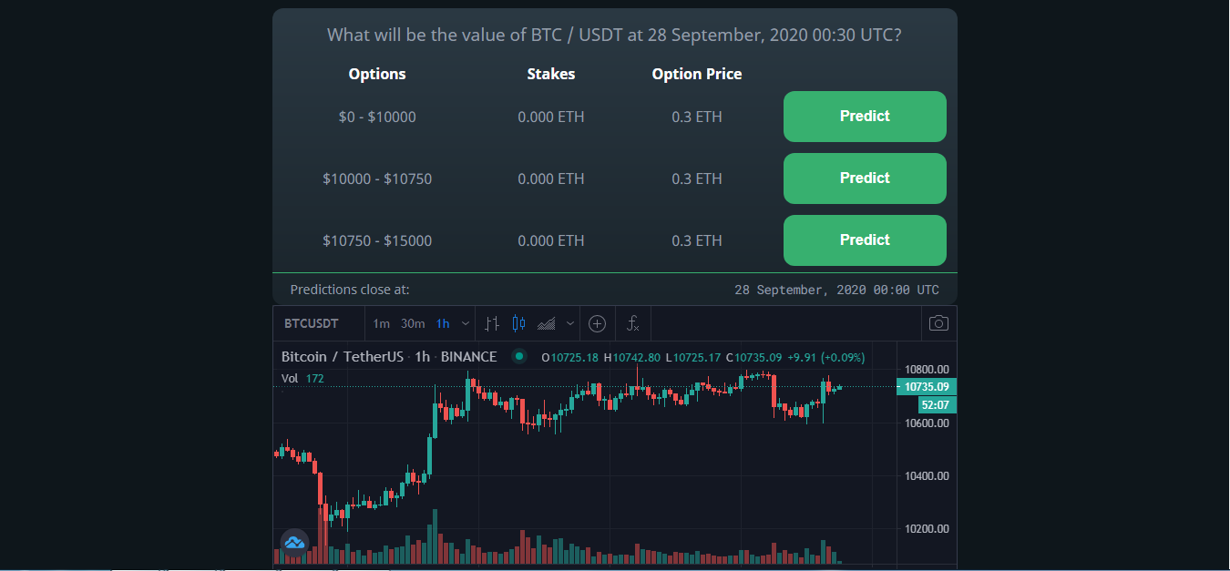 Each market represents forecast of a particular price feed and shall have option ranges to choose the answers from. Users can stake any amount into the option they think would represent the price and can win if the prediction turns out to be fruitful.