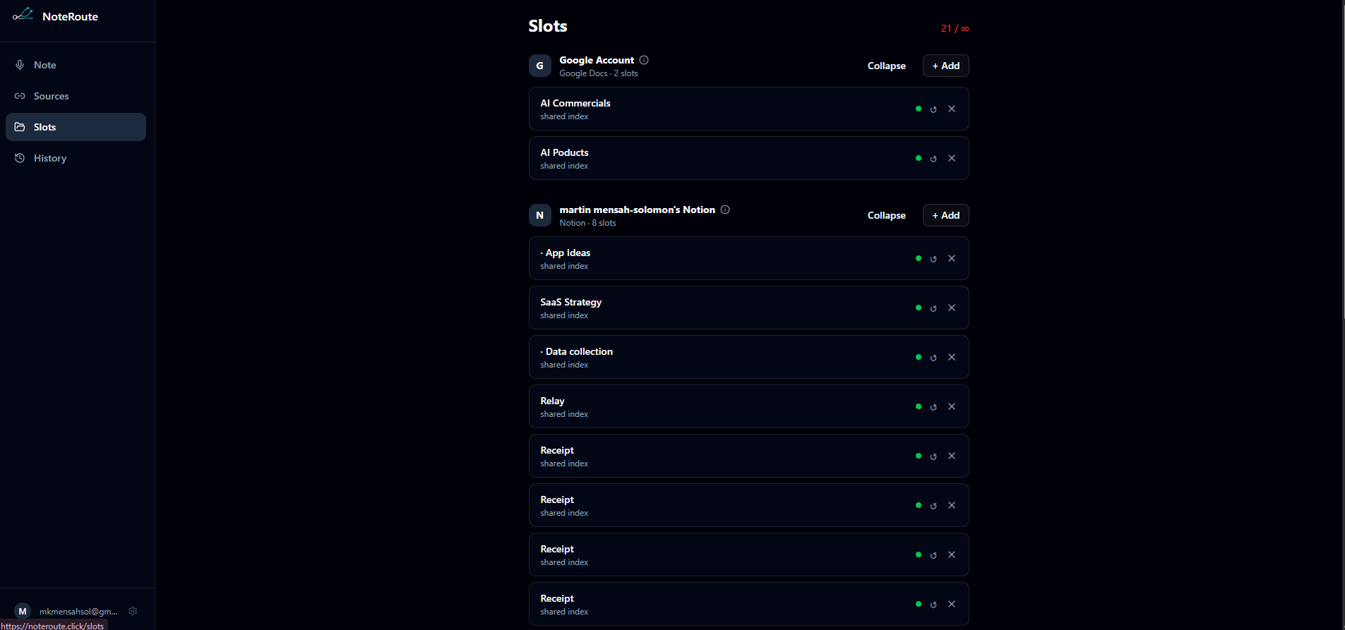 - Team workspaces — shared slot libraries so a team can collectively route notes into a shared Notion workspace or Slack channel