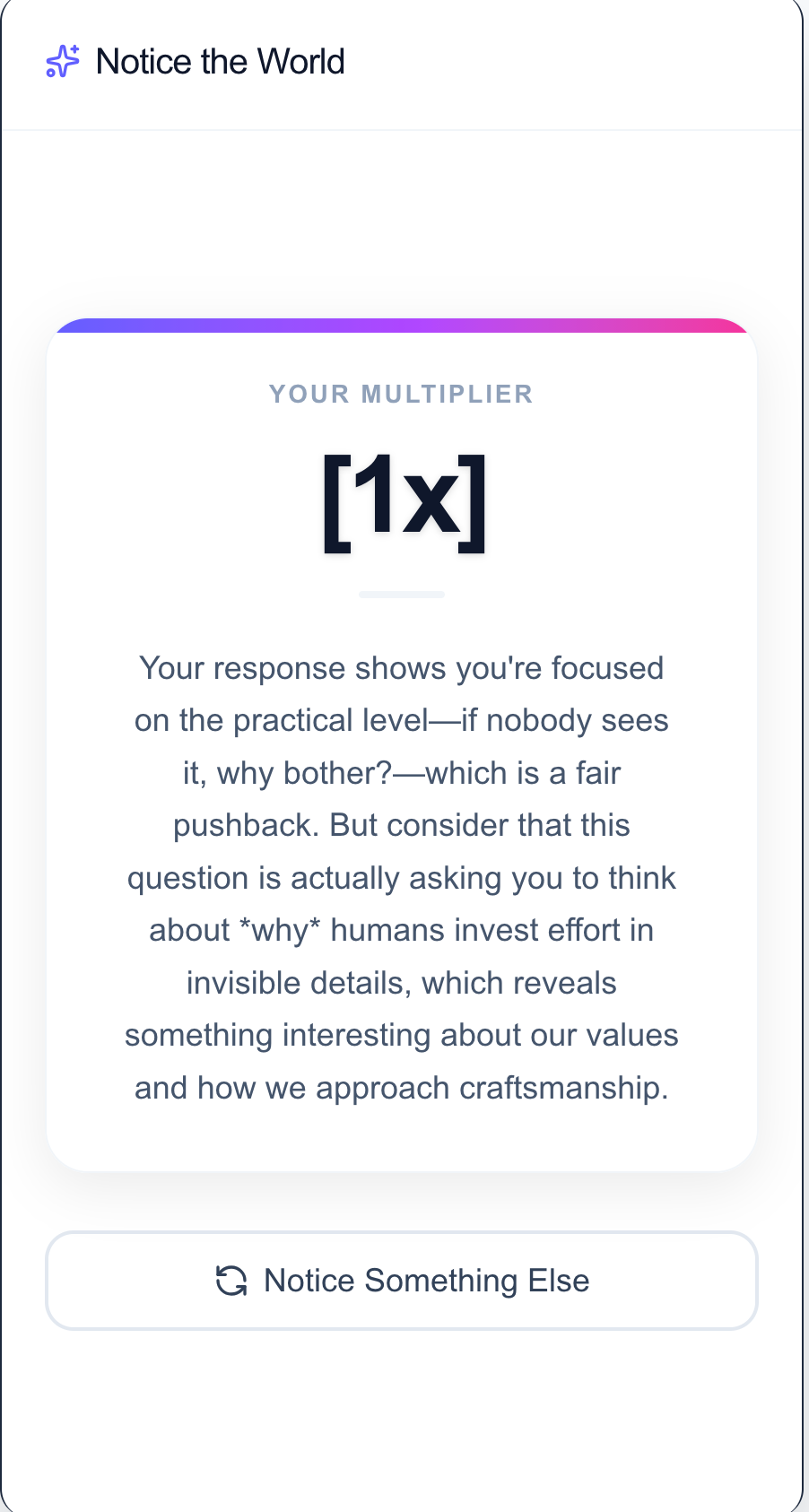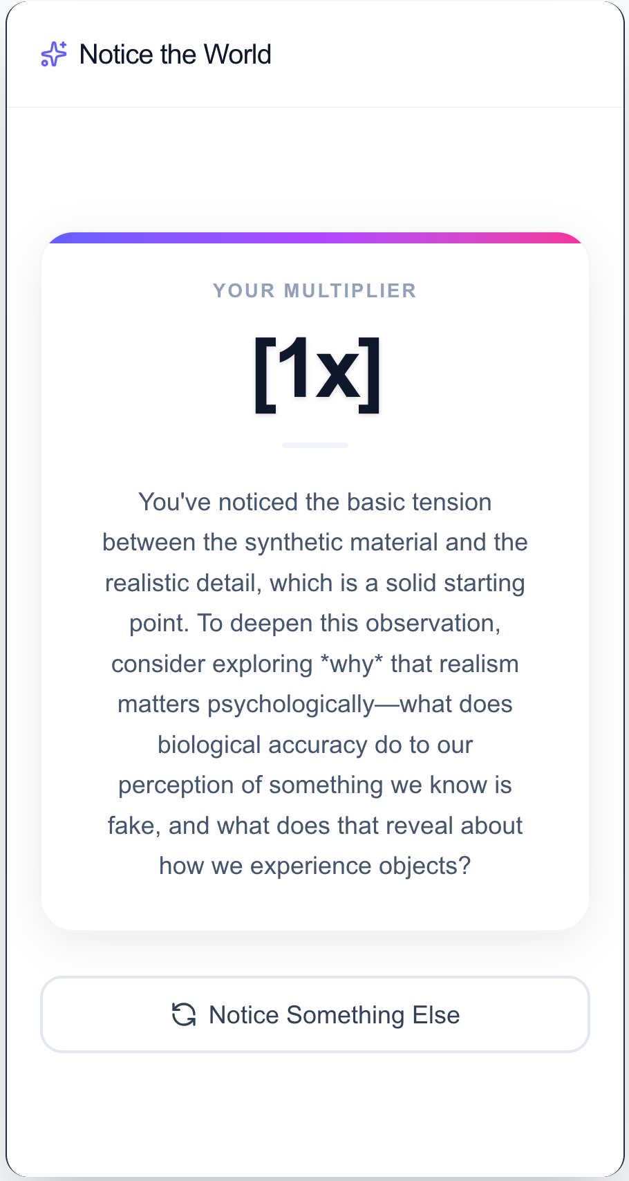 The Solution: The Noticing Engine I built The Noticing Engine to train your attention span. It’s a mobile-first app that uses AI not to replace human creativity, but to act as a personal trainer for it.