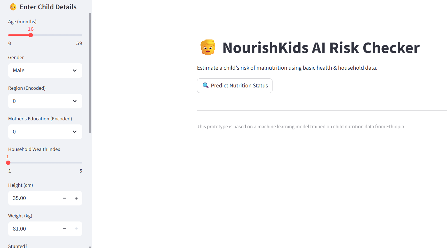 What I Built NourishKids is a lightweight AI tool that screens for early signs of malnutrition risk using a simple set of clinical and socioeconomic indicators: age, height, weight, maternal education, anemia status, and others. It is intentionally designed to work in low-connectivity settings.