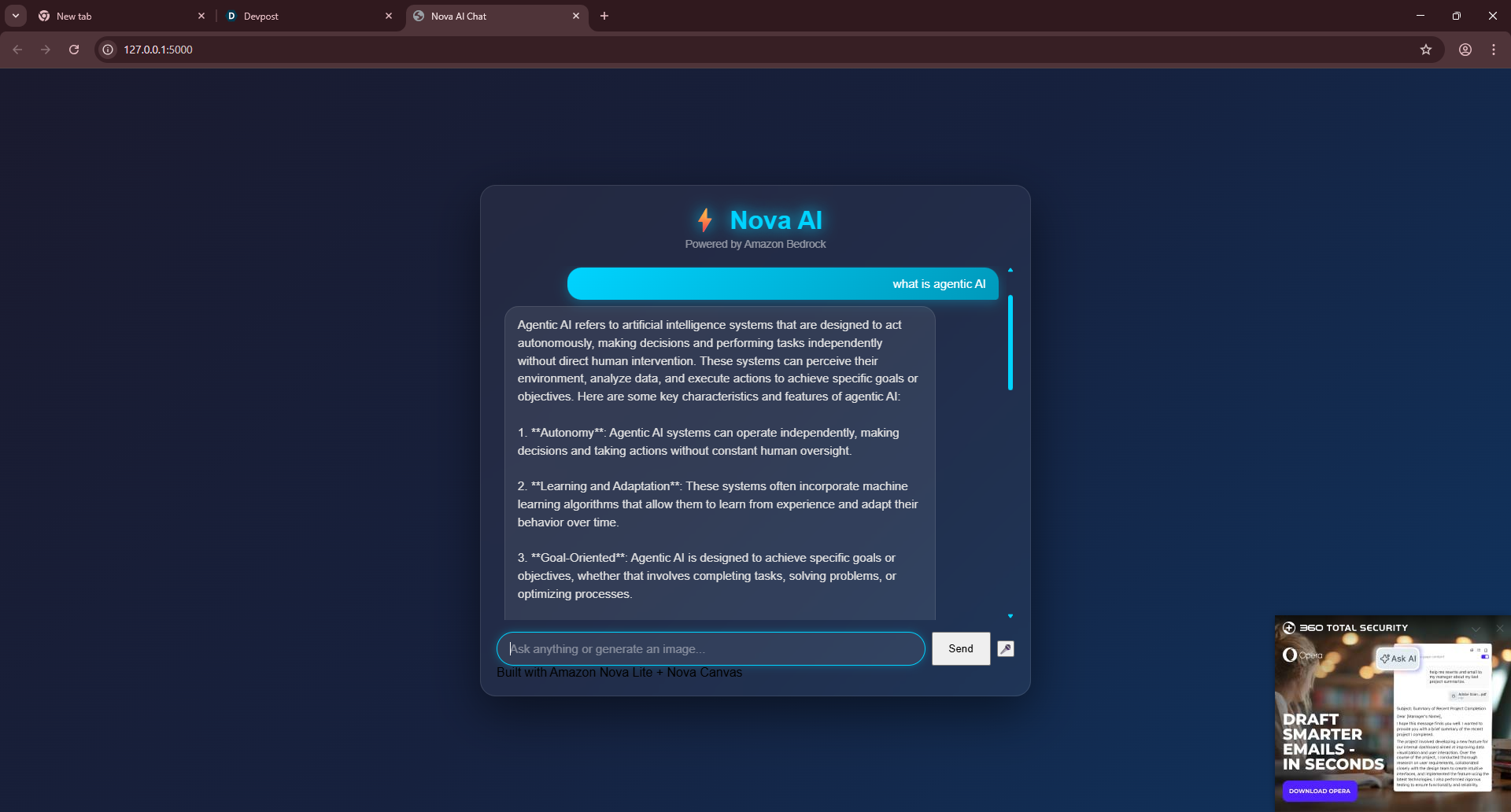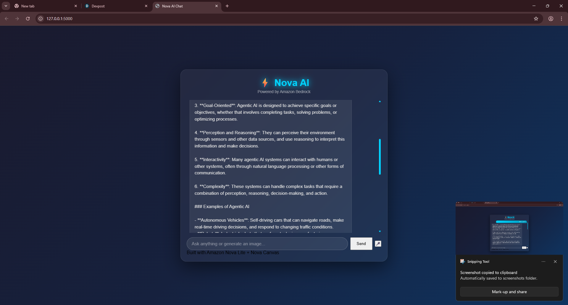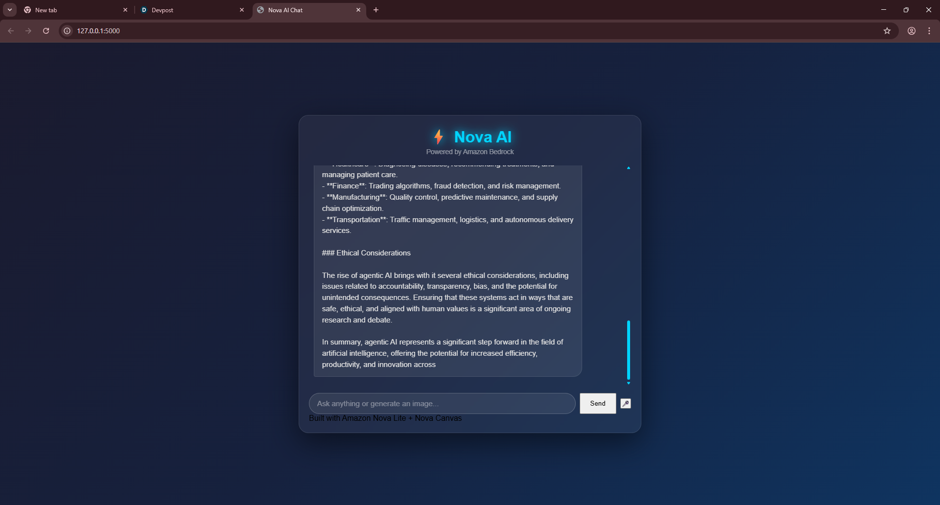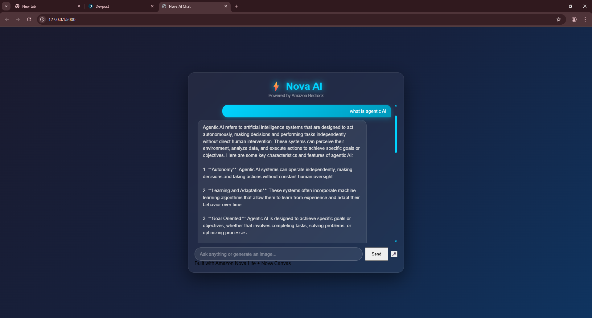 ✅ Successfully integrated Amazon Nova AI for both chat and image generation ✅ Built a fully functional web app from scratch during the hackathon ✅ Created a single unified interface that handles both text and images seamlessly ✅ Kept the app simple and user-friendly — anyone can use it without any technical knowledge ✅ Learned and implemented Amazon Web Services tools for the first time
